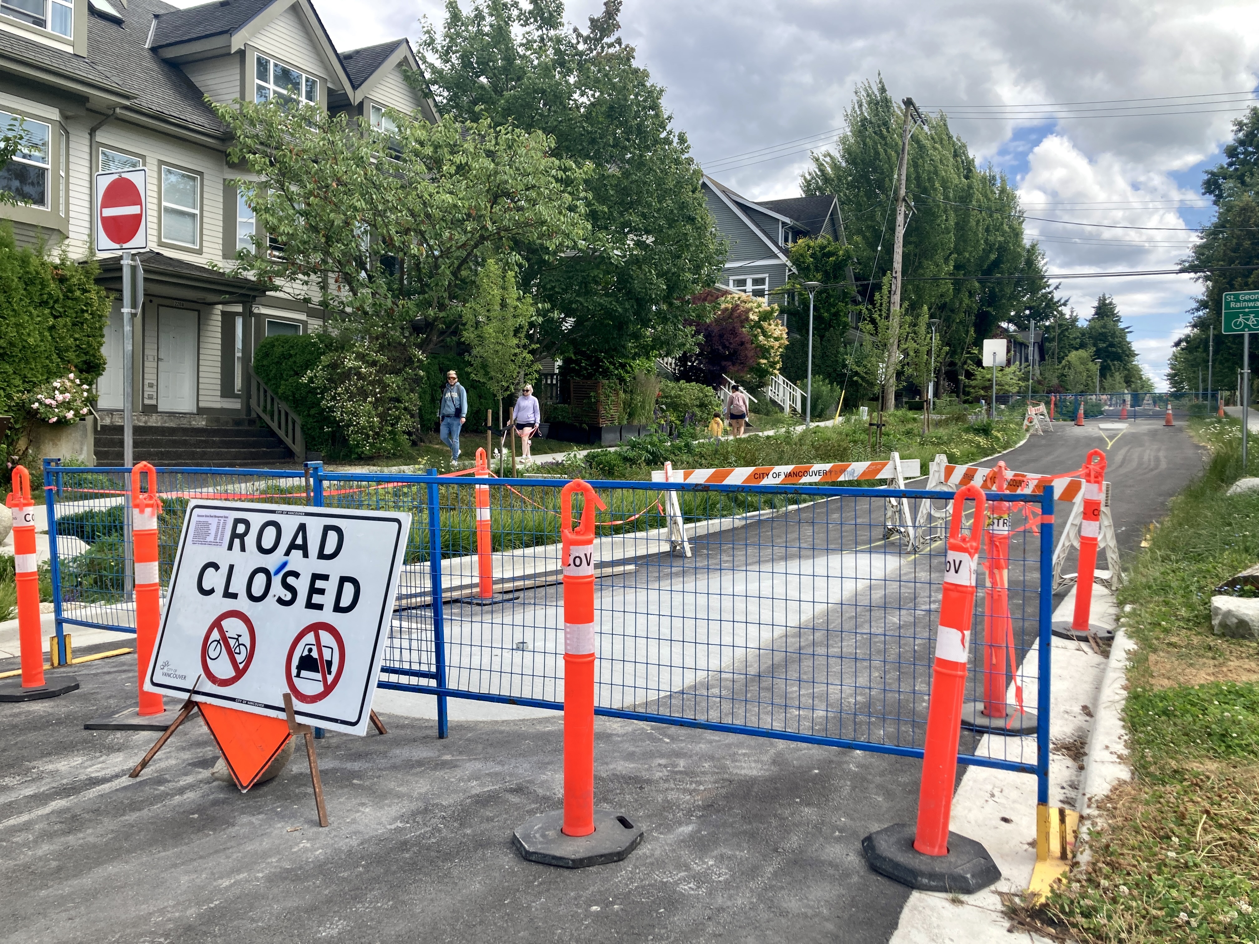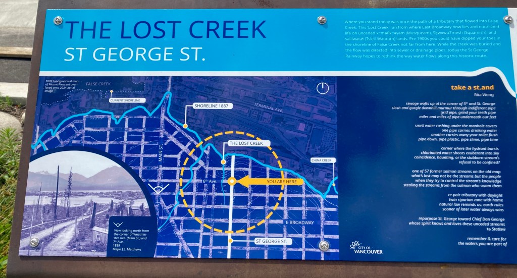 Together, we learn that the Rainway along St. George celebrates a Lost Creek, a tributary to False Creek that has long since been buried underground. (For that matter, this final eastern end of False Creek, into which the lost creek ran, no longer exists either.)