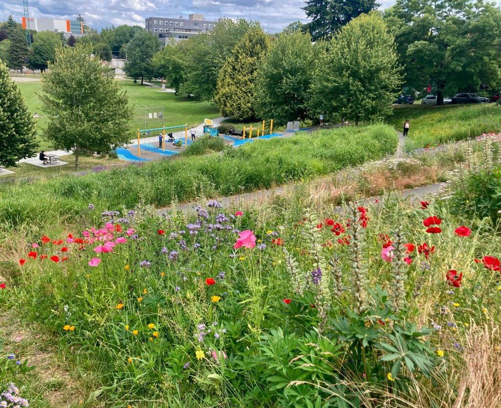 This park is another “Lost Creek” — or, more precisely, a Lost Watershed. Before this last bit of False Creek was filled in, a whole network of creeks tumbled through here to feed its waters. Once filled in, the area at one point became a garbage dump, but was subsequently rescued and turned into parkland.