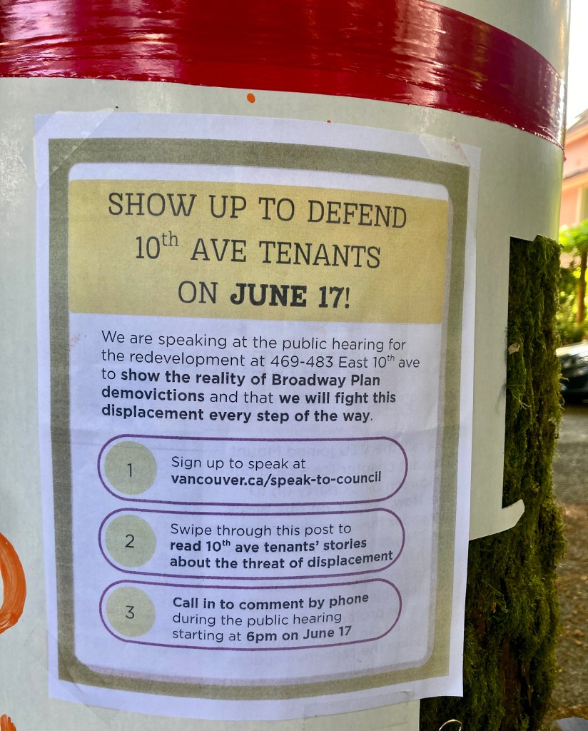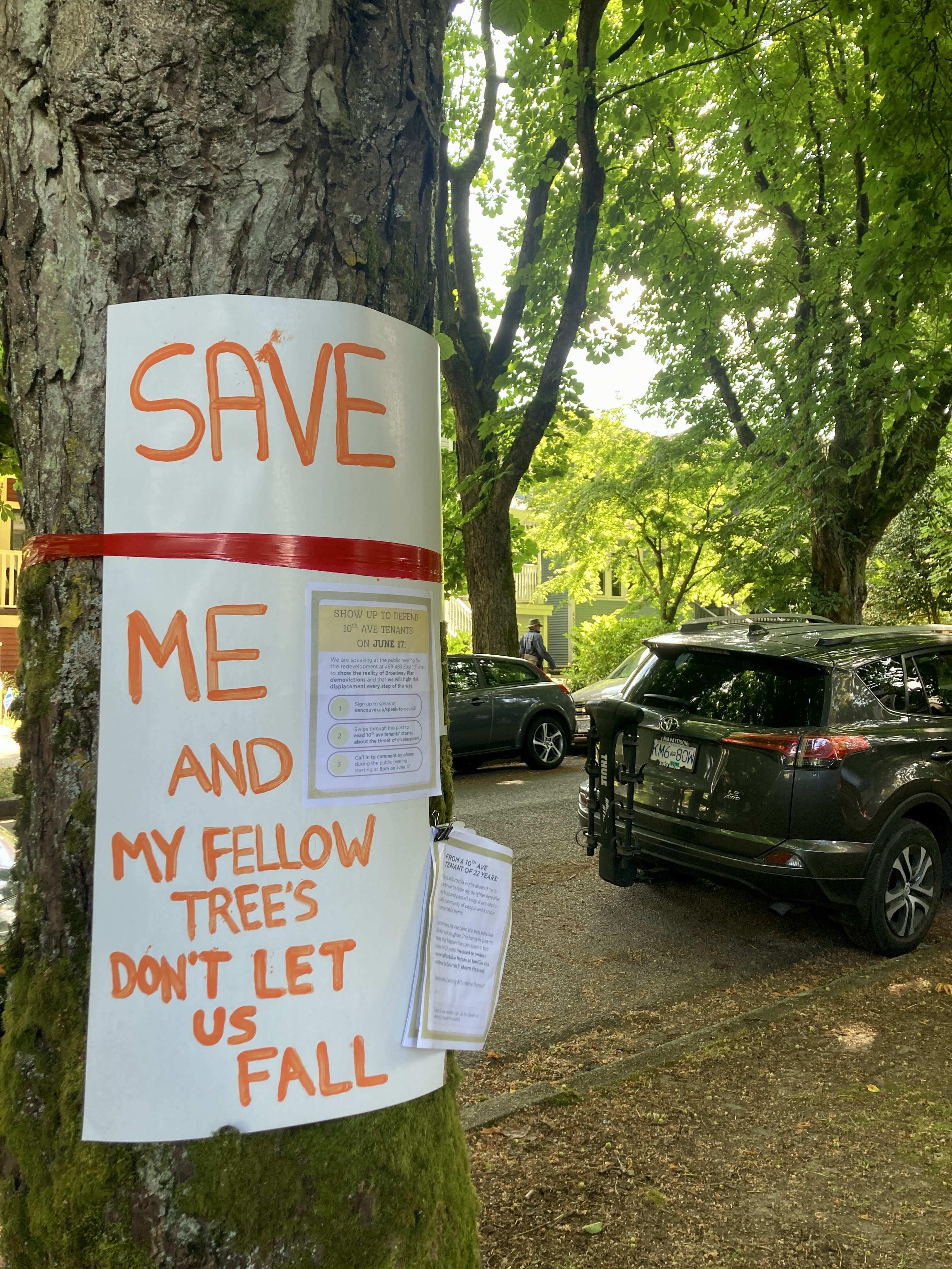 Taped to a tree on quiet, residential East 10th just west of St. George — with its fellow trees all around — a warning about the effects of the redevelopment now being pursued under the City’s Broadway Plan.