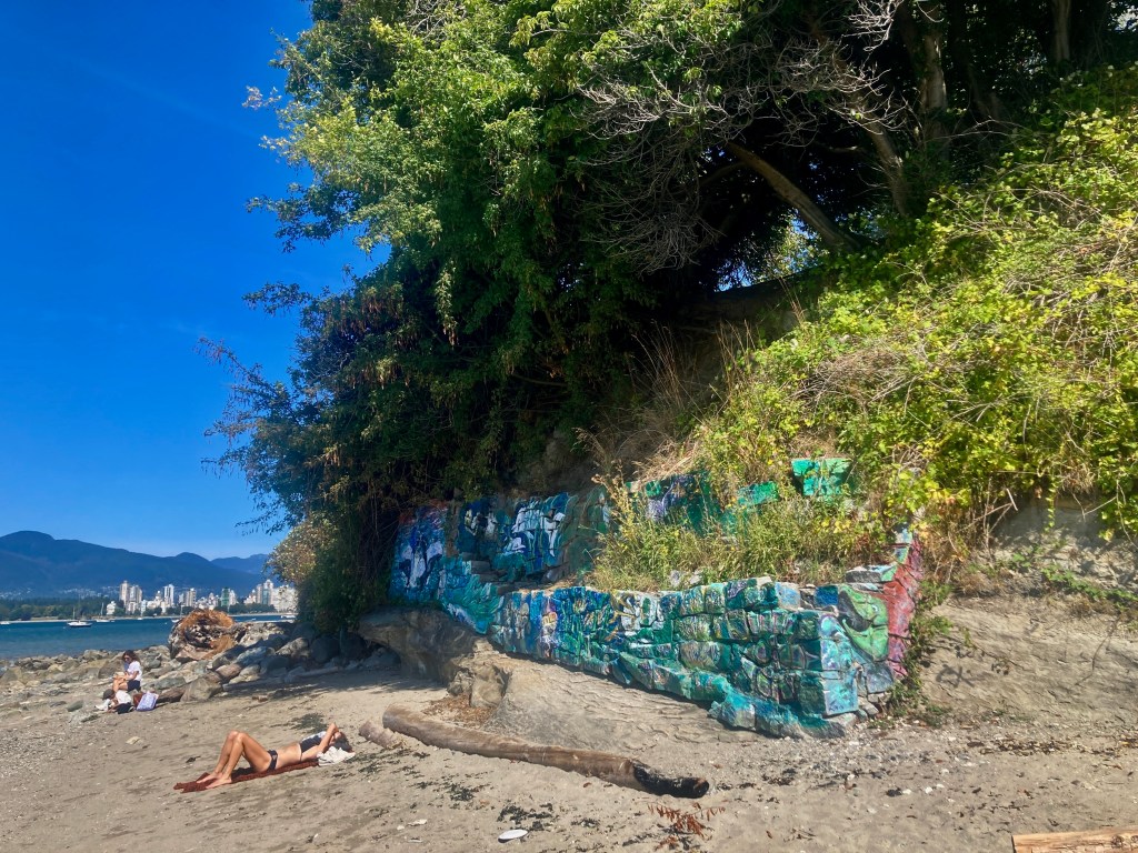 The stone wall is official; the colours, anonymous and unauthorized. I sidestep both the path and the bronzing bodies beneath it, and return to water’s edge.