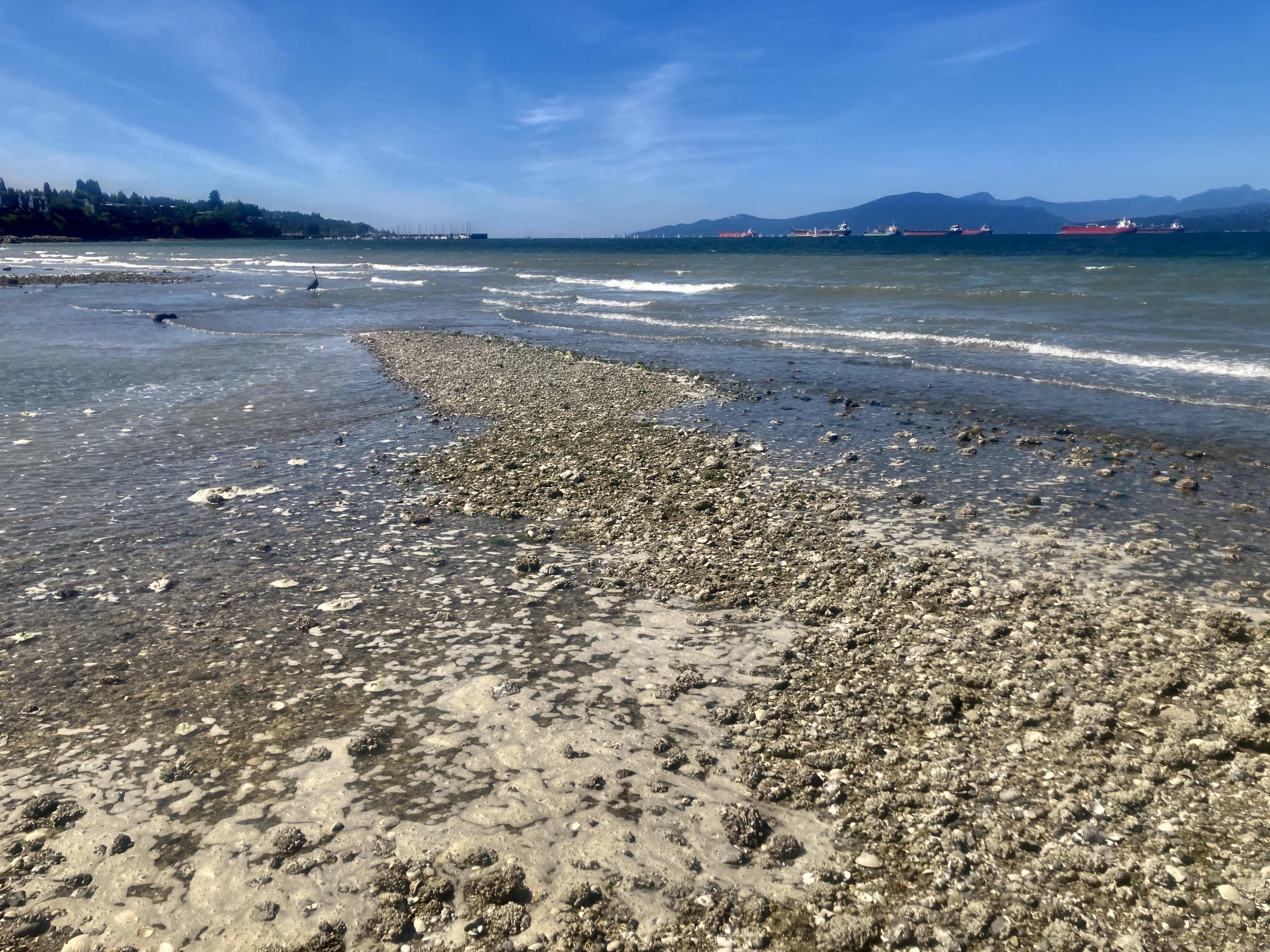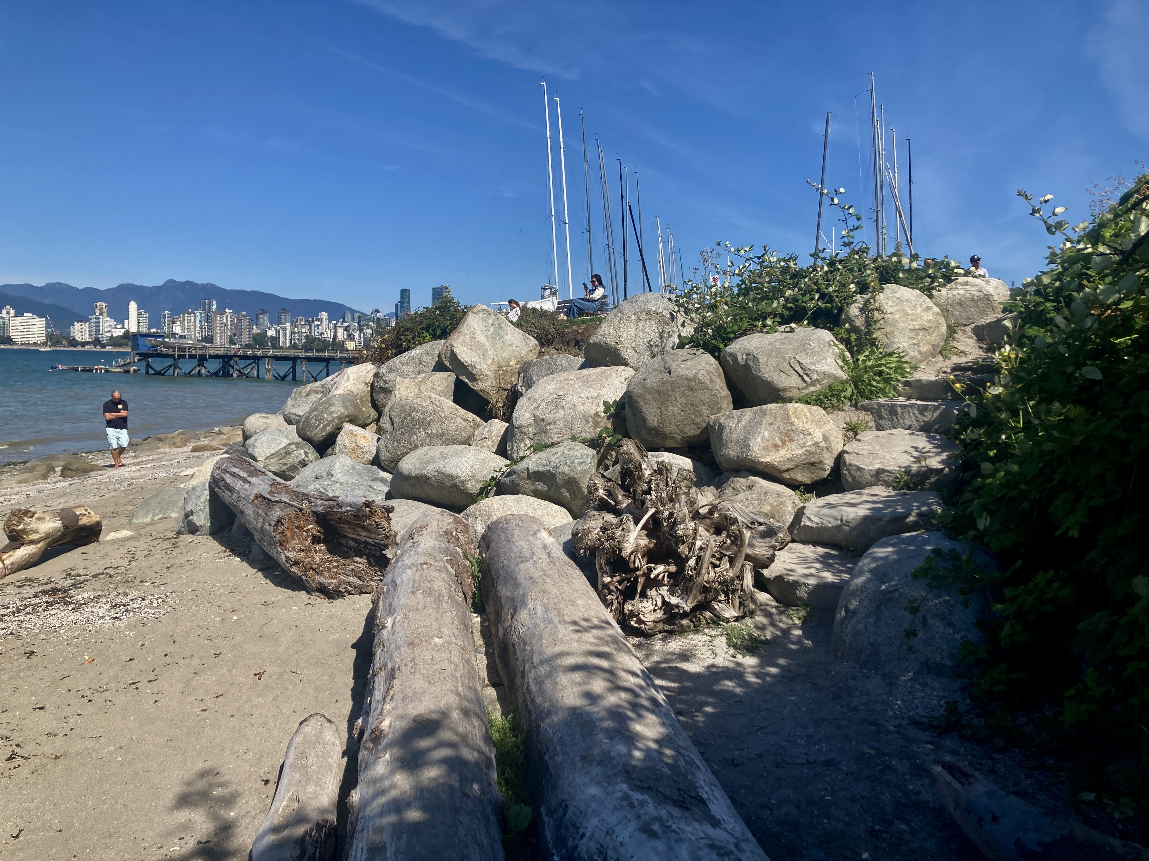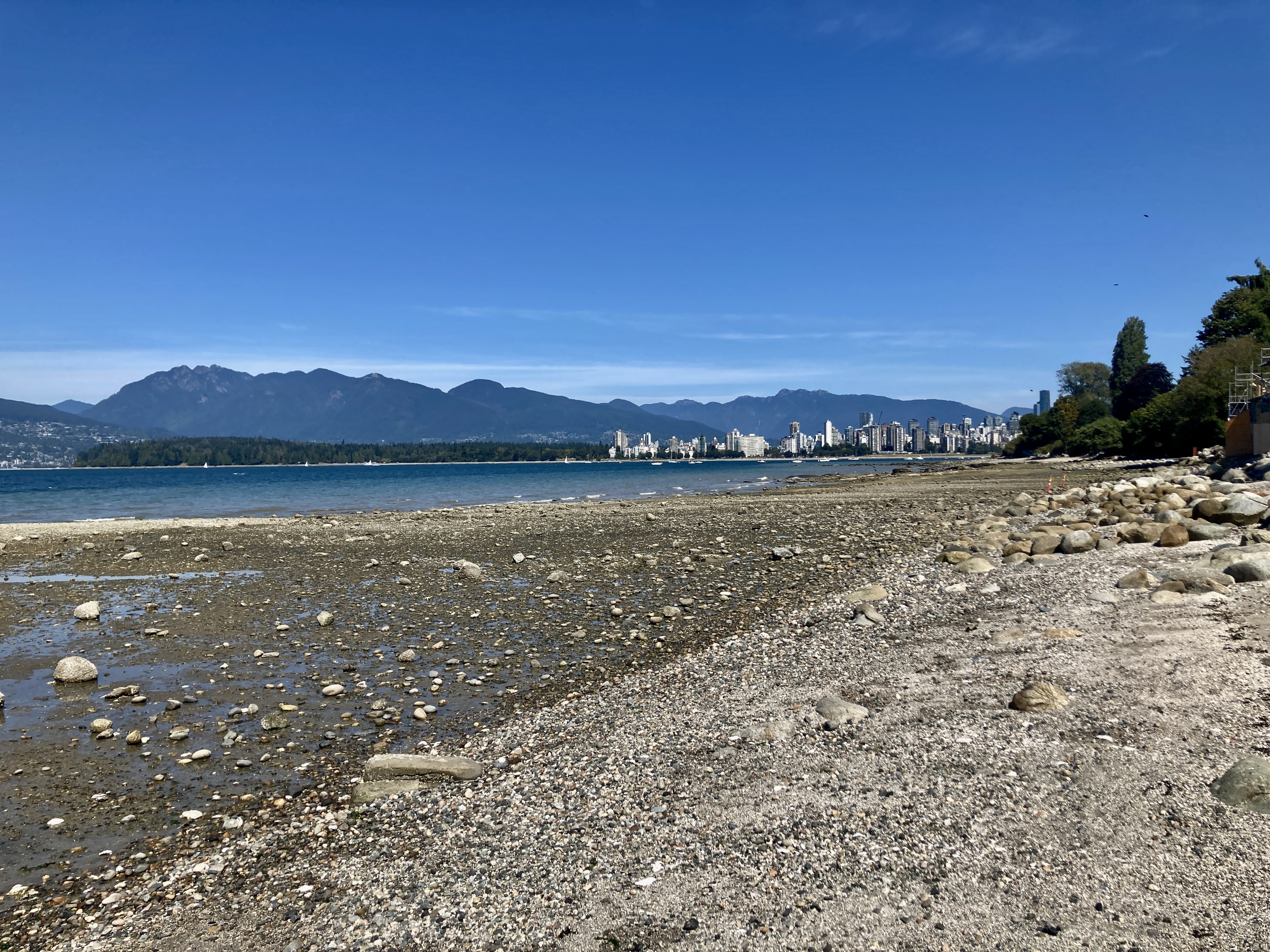 and this time my gaze takes in the green sweep of Stanley Park, the final knob of the City of Vancouver this side of the North Shore, and, to its right, the towers of the City’s downtown cluster. I’ll be walking east, from here to Kitsilano Beach Park.