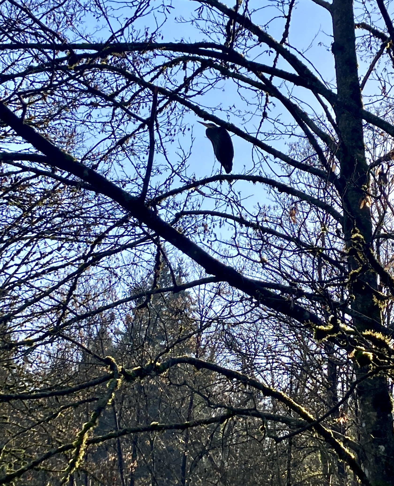 A great blue heron sits tall, still and stately in his tree beside the river…