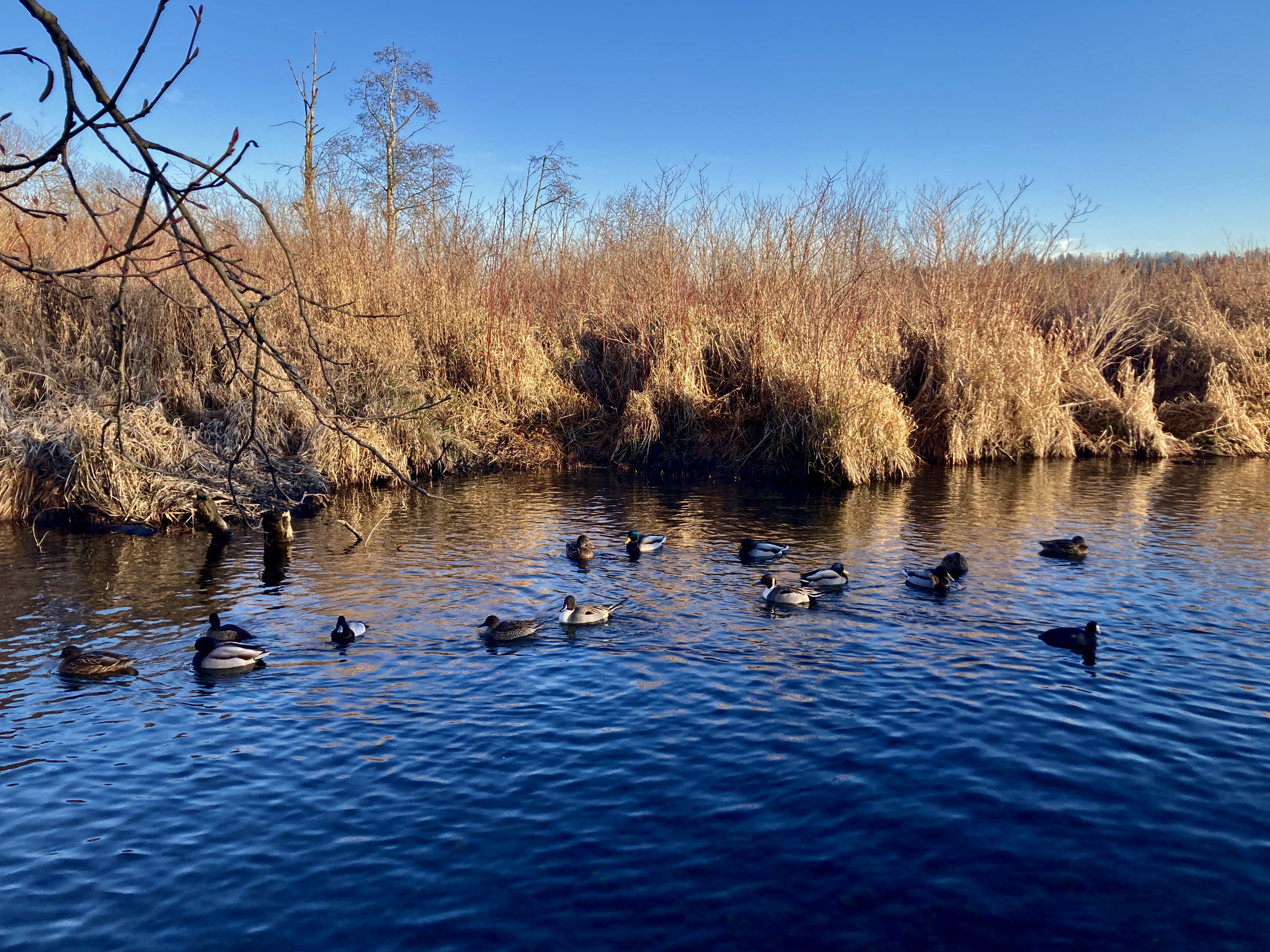 The waters along this path teem with happy ducks. Even my uneducated eye can pick out mallards, pintails, golden-eye and coots, as they mill about.