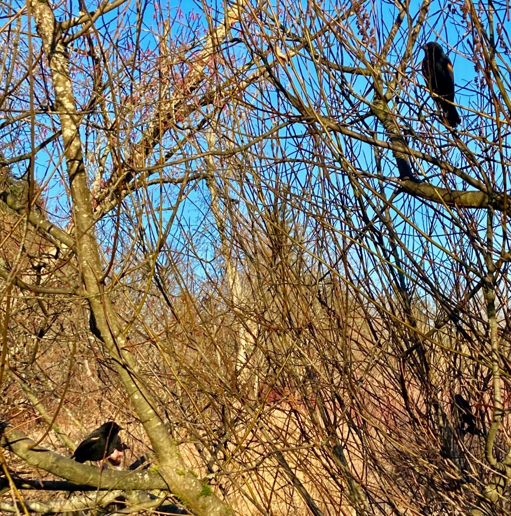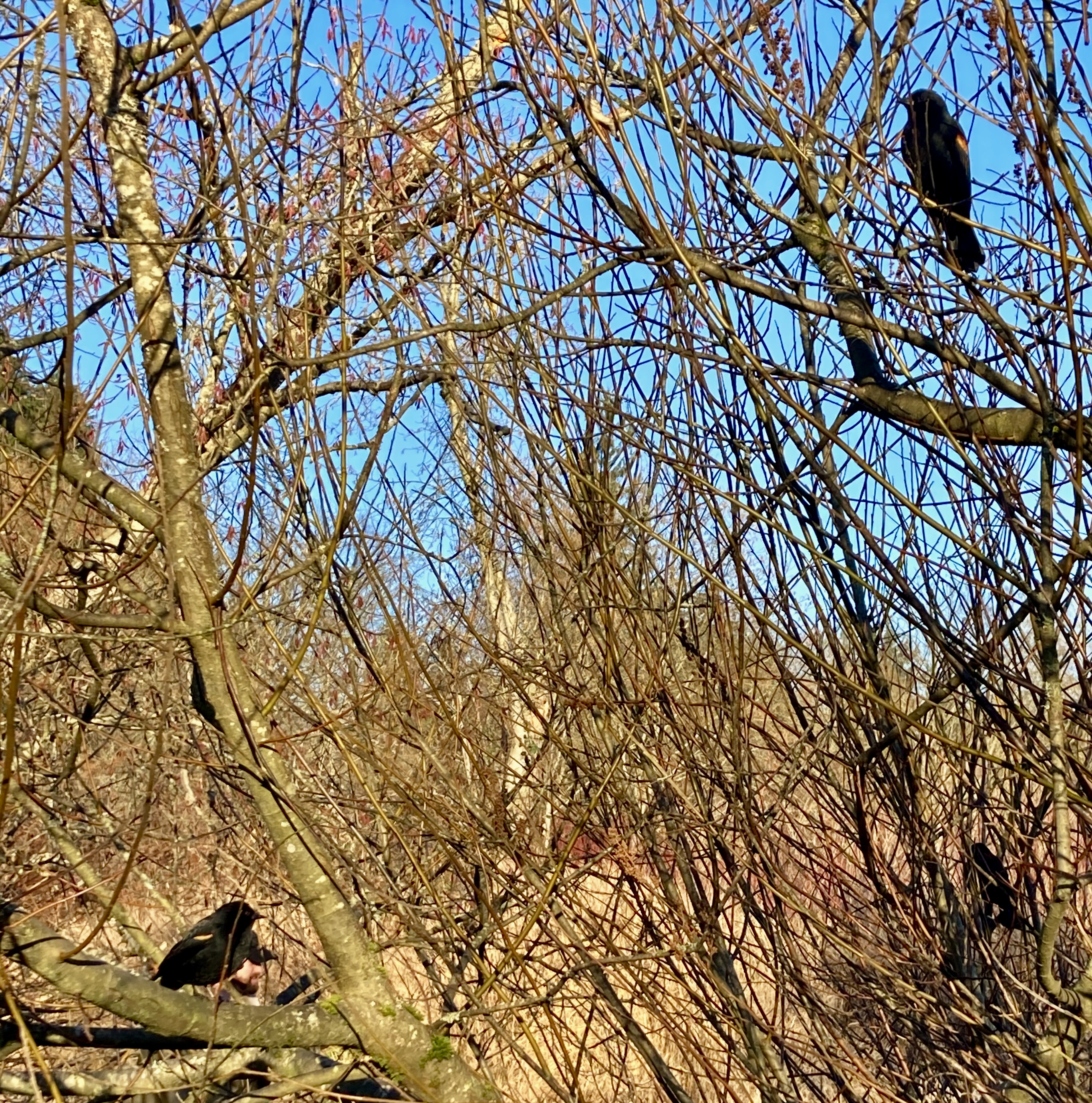 I confess: I deny these guys are red-wingers until they flash those chevrons. “Well, they don’t sound like red-wing blackbirds,” I grumble. Then I have to consider that this lot is a long way from the lot that my ear knows best, back in Ontario, and they probably have their own distinctive accent. (Am I right? Am I silly? Somebody please tell me.)