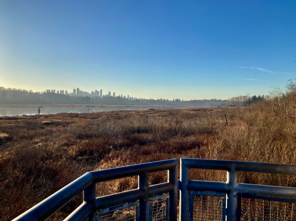 for a long view across grasses, lake and woods beyond, right to the towers of downtown Burnaby.