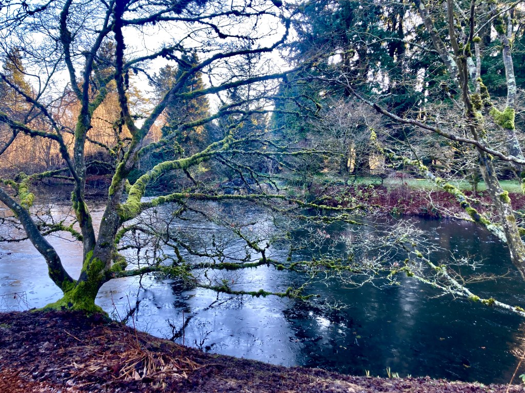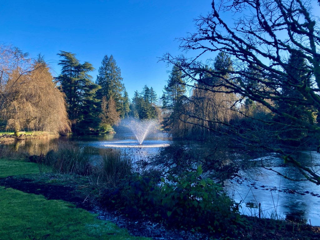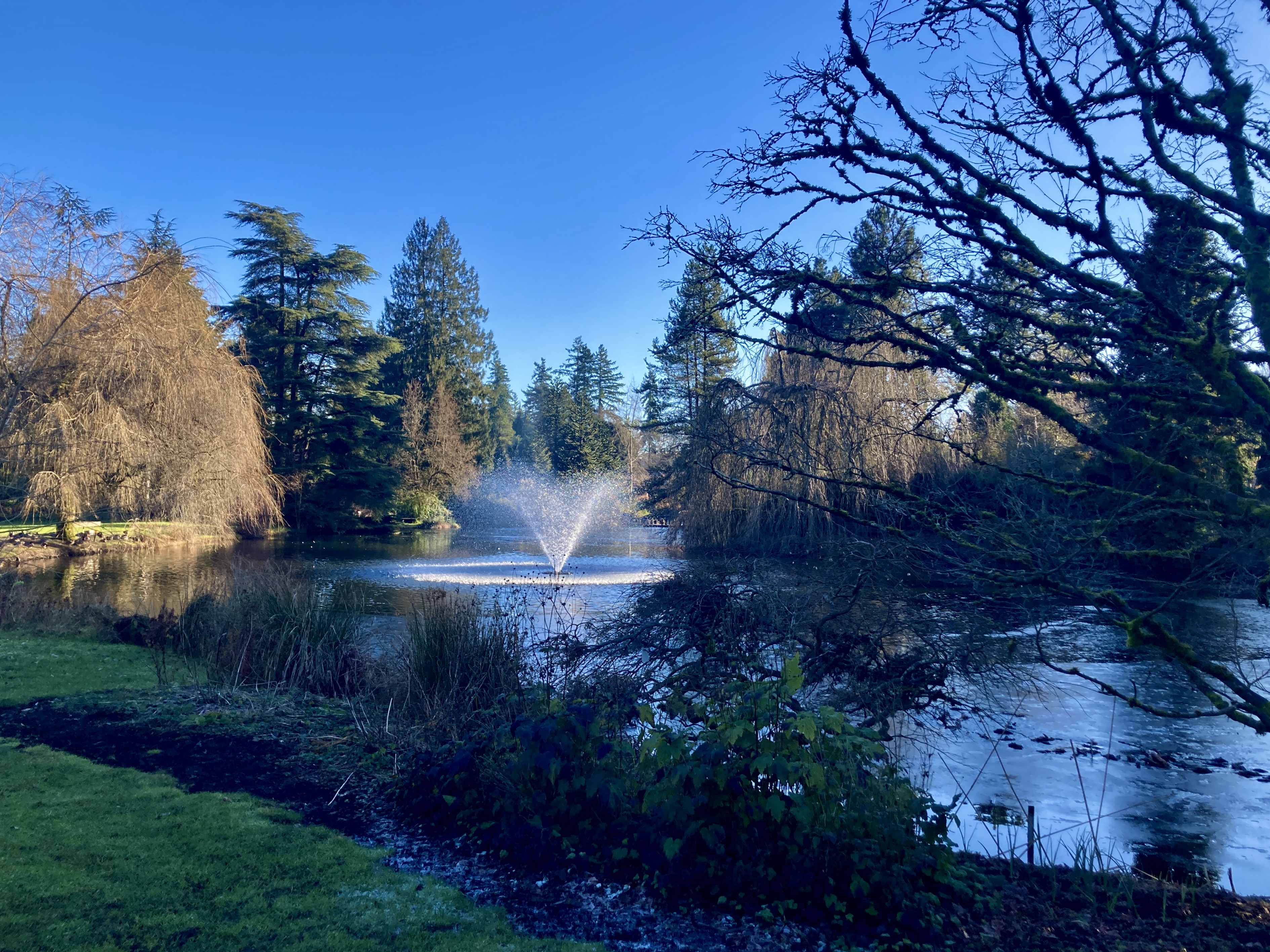 and sometimes draped along the branches of sibling Japanese maples, touching fingers above Heron Lake, itself adorned with a rare skin of ice.