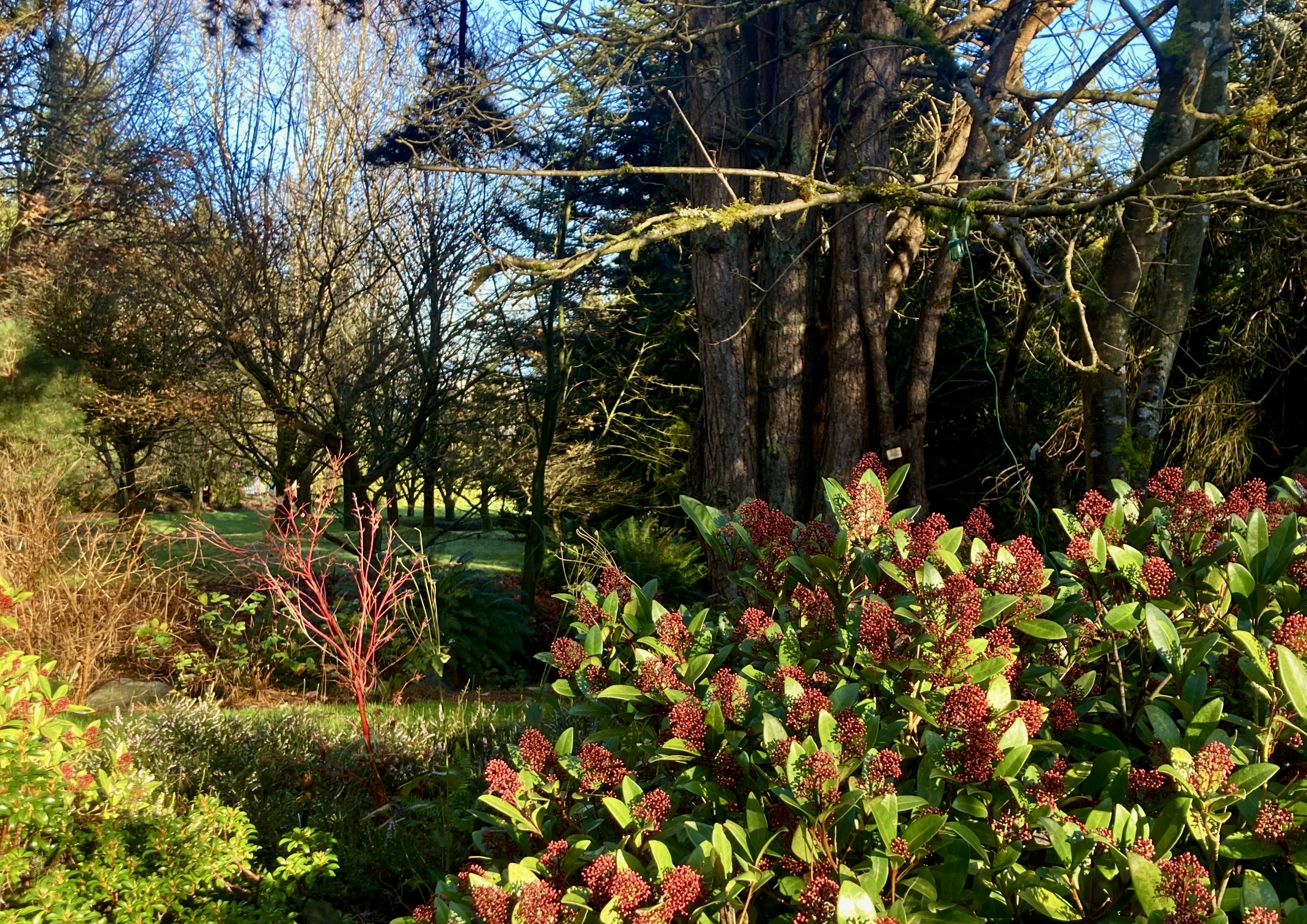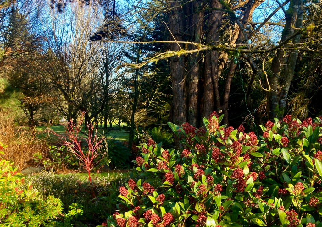 A fiery Red osier dogwood, for example, there in the middle distance, with bright Japanese skimmia right here at our finger tips.