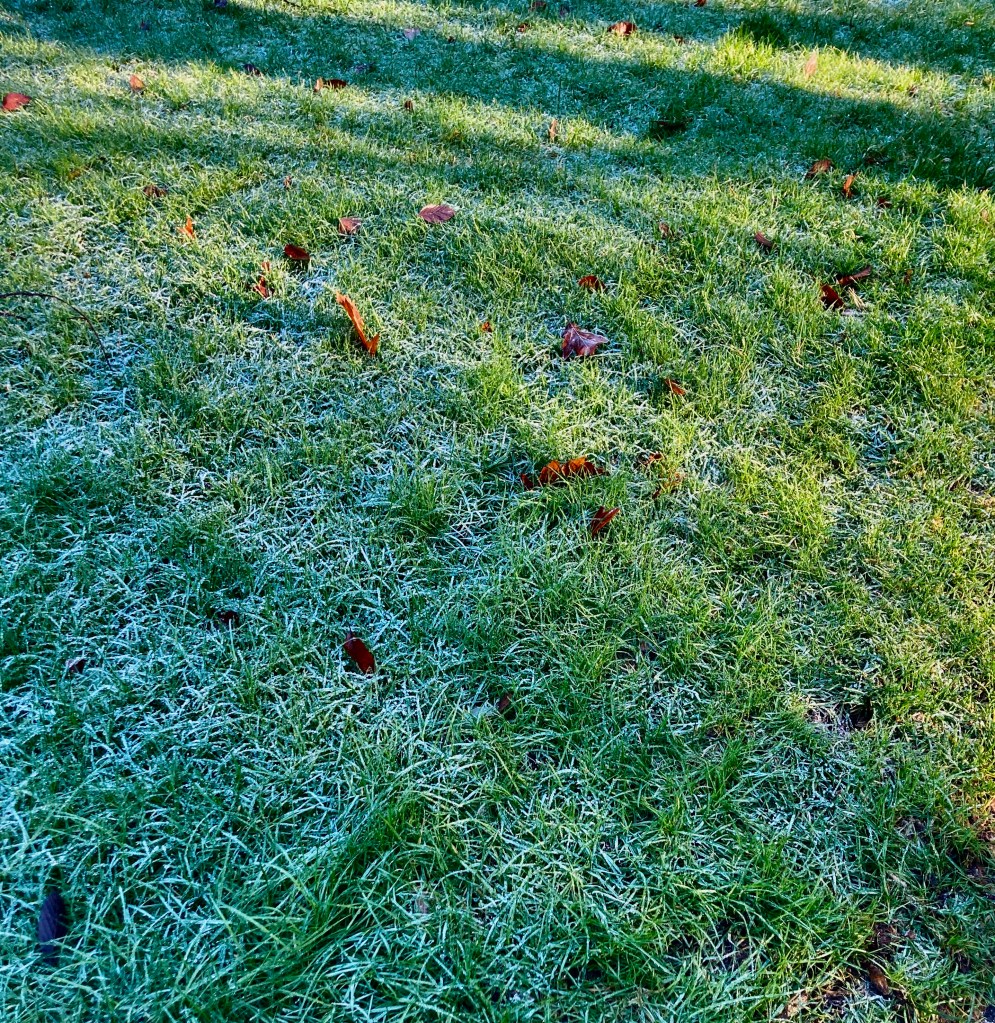 Sun overhead, and hoar frost sparkles on the grass.