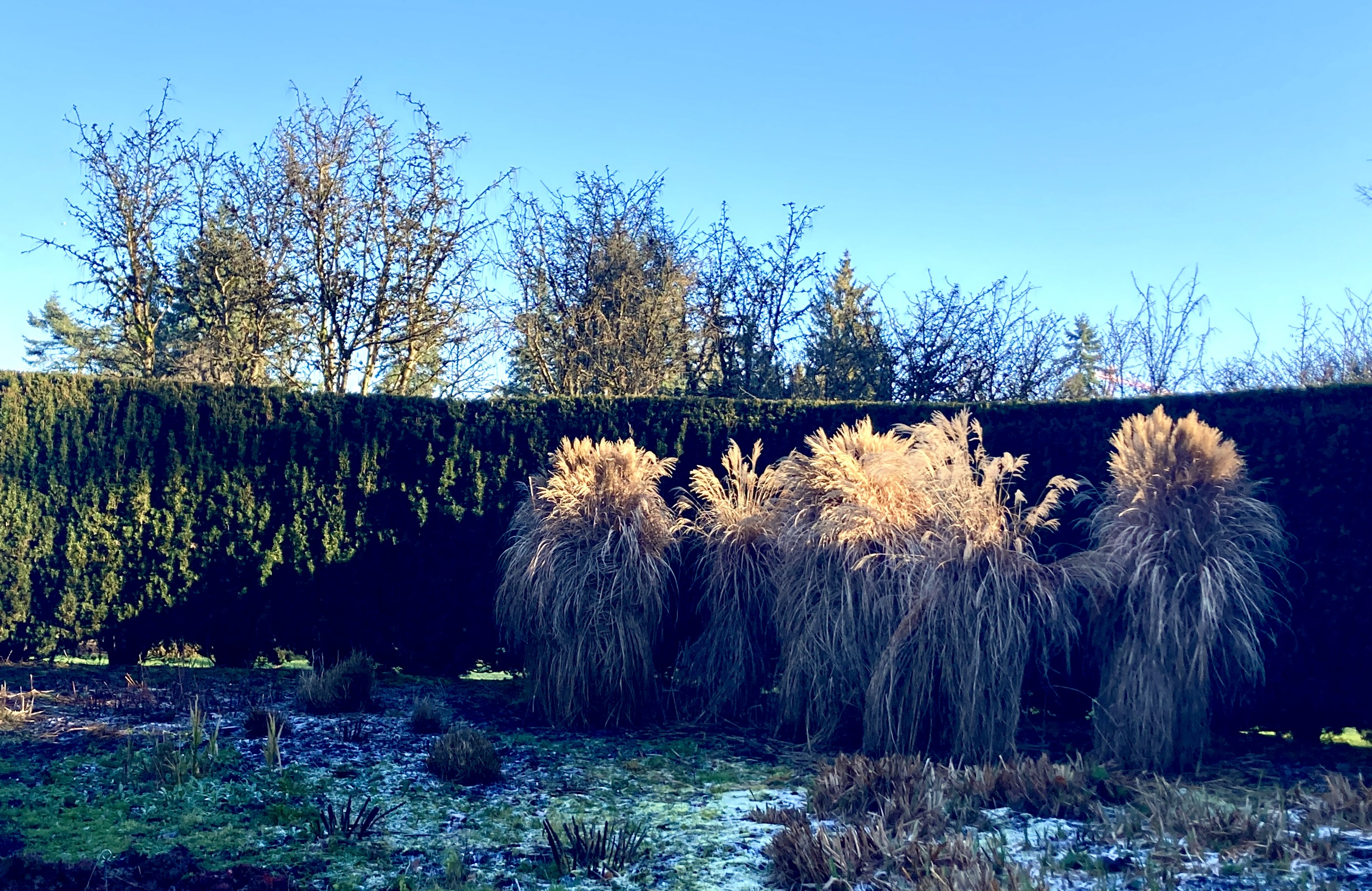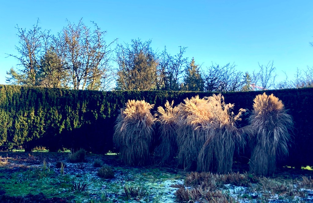 dancing their feathery tips over plant stalks in the flower beds. These plants are pruned for winter and currently anonymous, but their time will come.