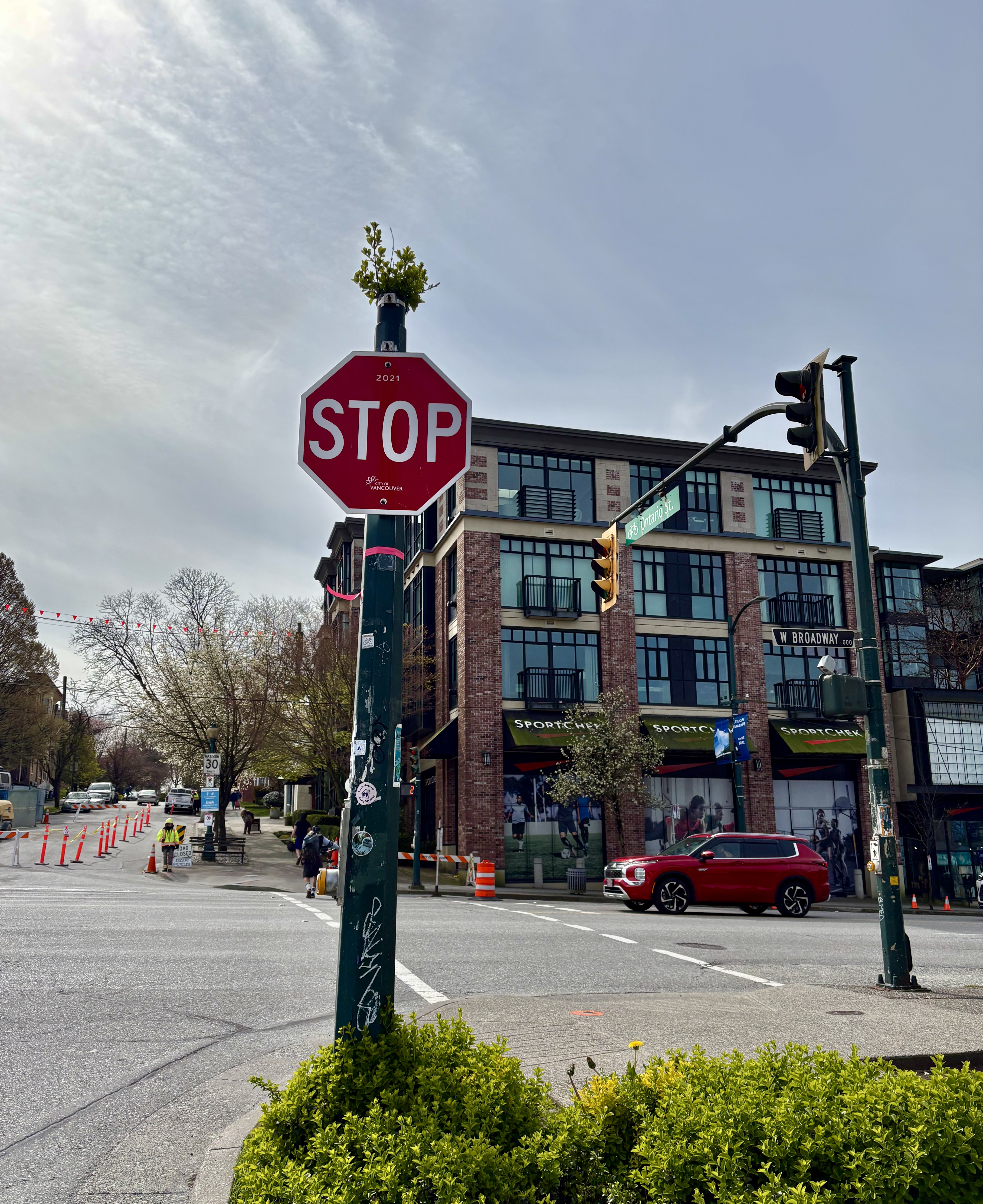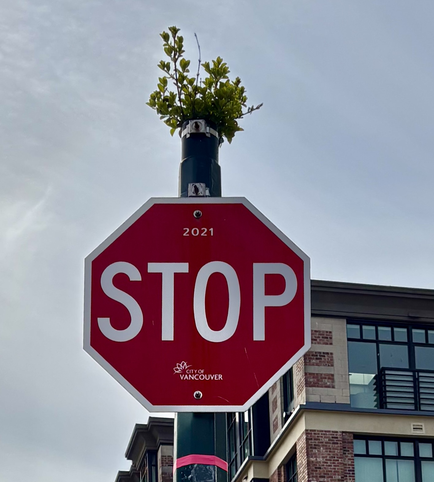 What knocked the official top-of-sign off the sign? What then deposited enough city grit & grime in the sign pole to form a growing medium? How long did it take? What then (wind, bird, Act of God) deposited mystery seeds — plink!!! — so precisely into that growing medium? When did that happen?