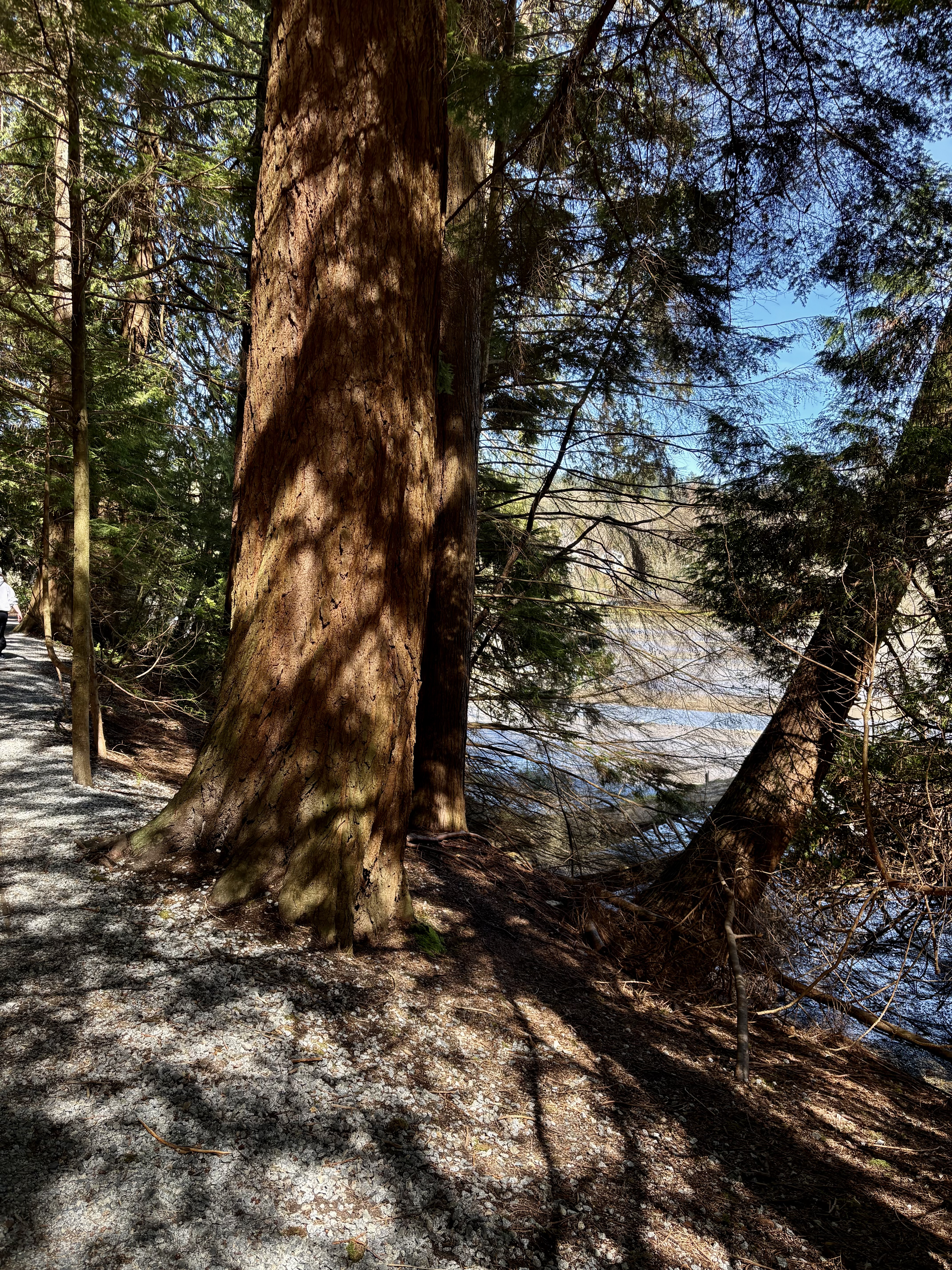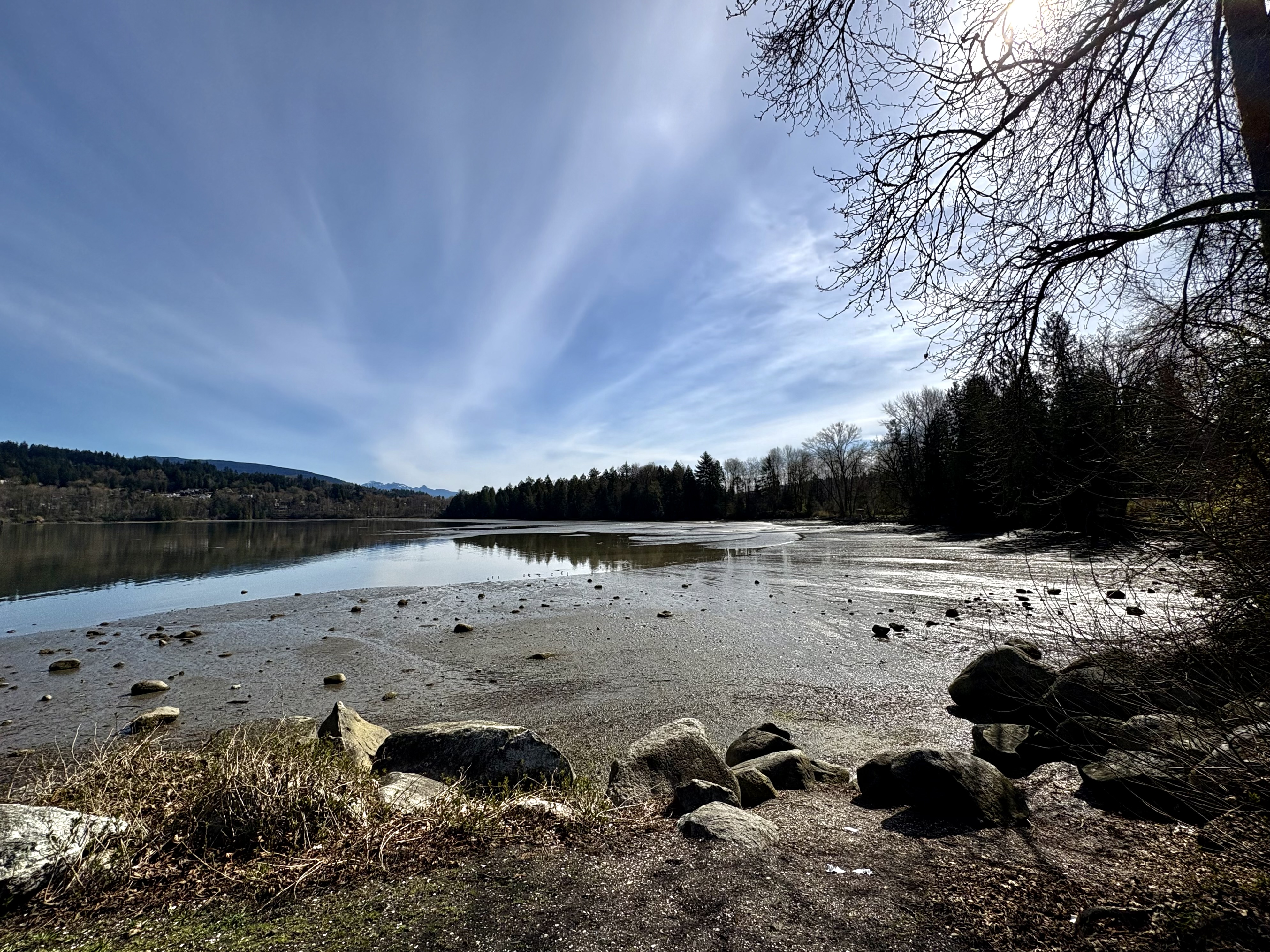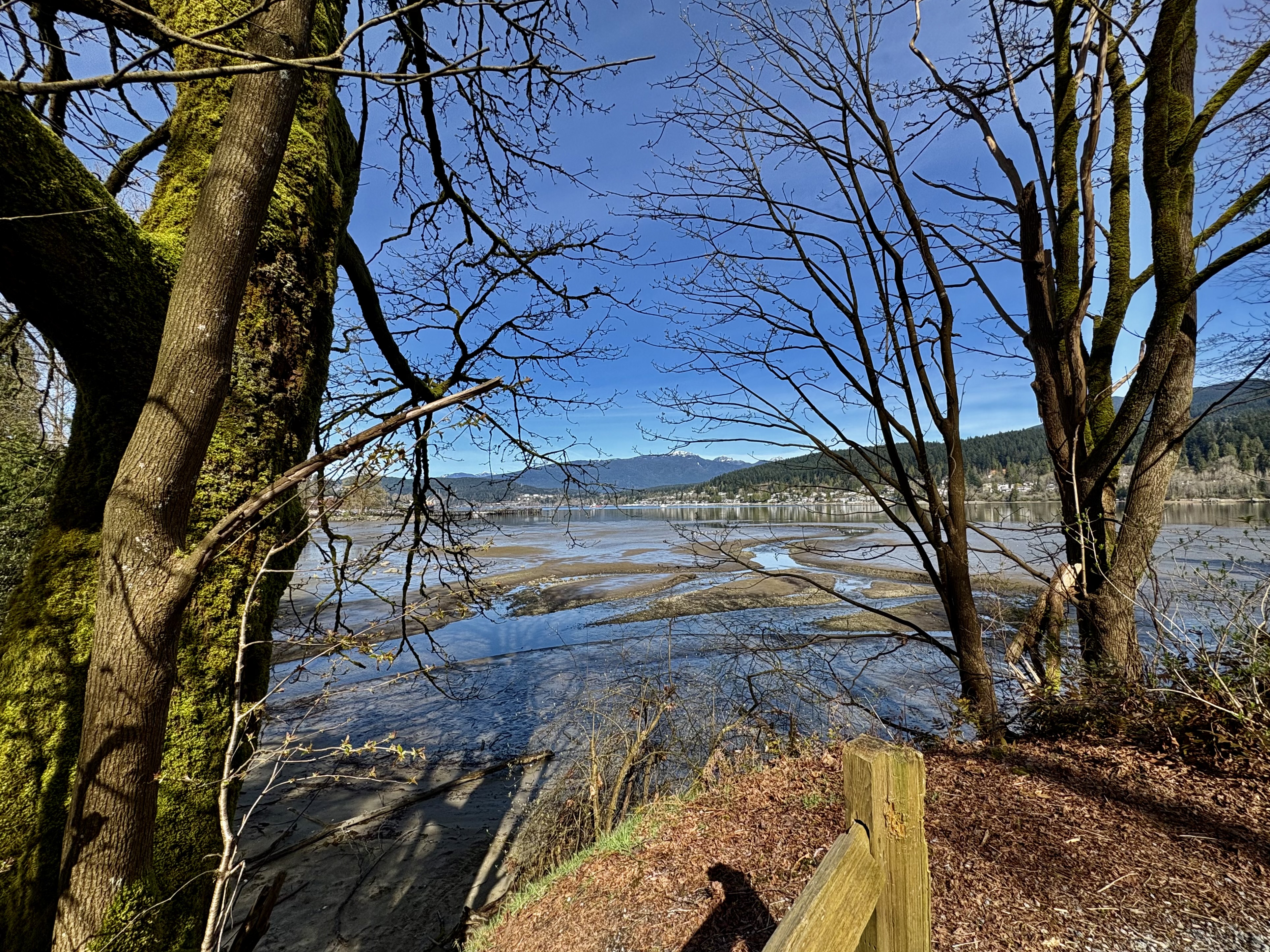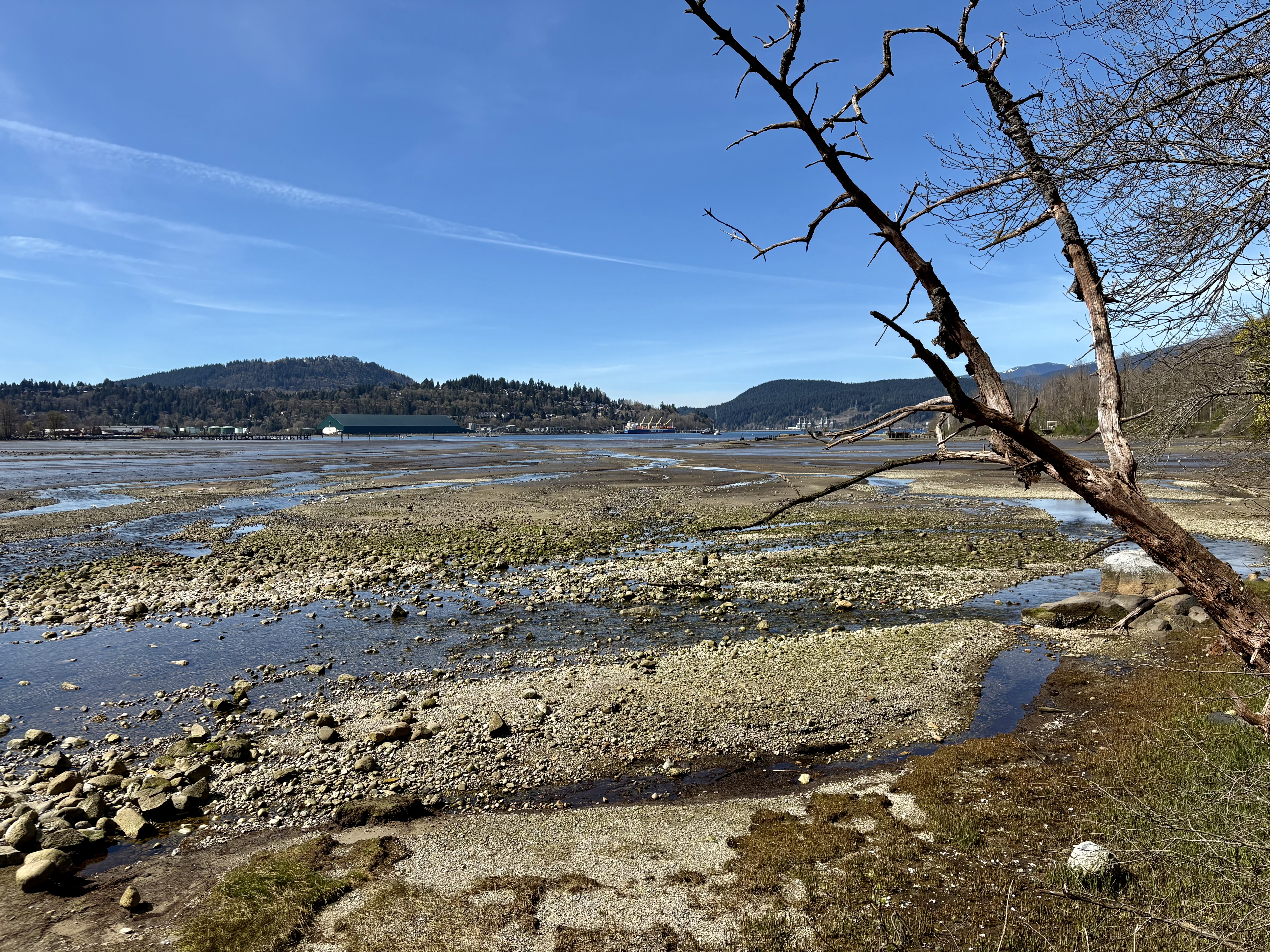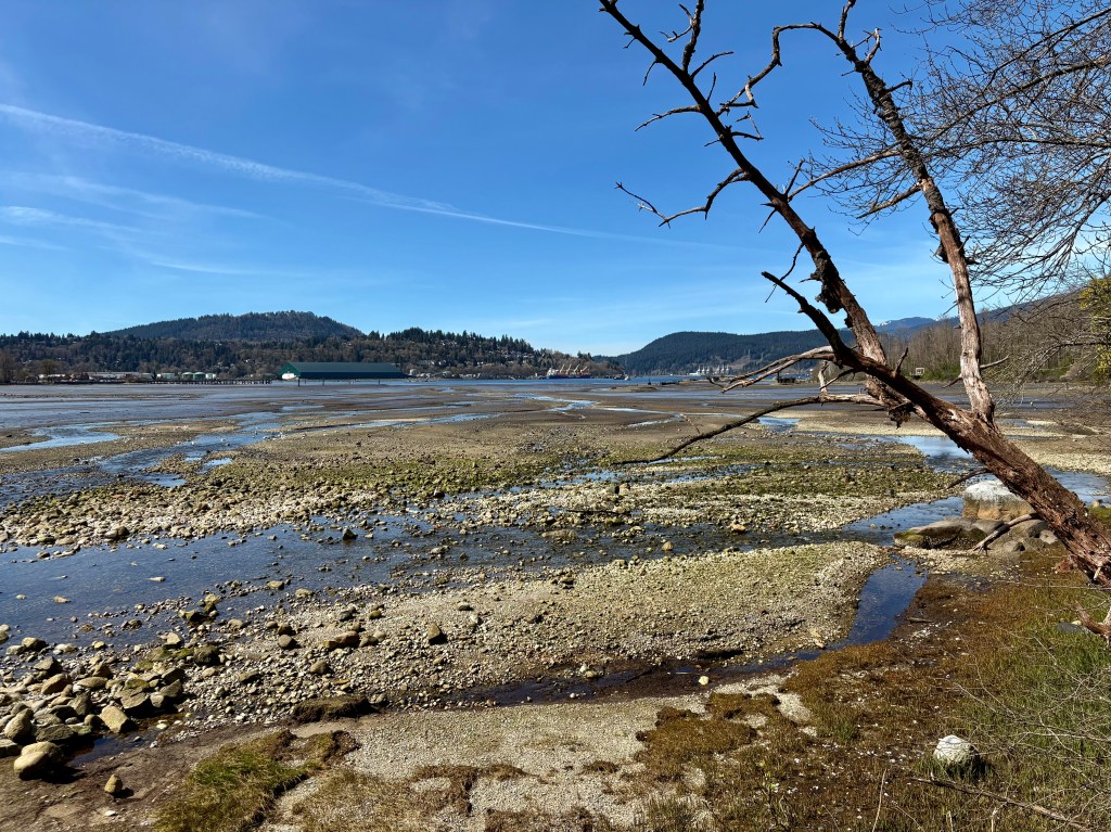 I’m in Rocky Point Park in Port Moody, headed for the Shoreline Trail that curves around the far eastern end of Burrard Inlet. It’s in forest — but right on the edge of the forest, with constant water views. For example, the mud flats I’ve just shown you — all the more dramatic with the one-two punch of low tide and bright sunshine.