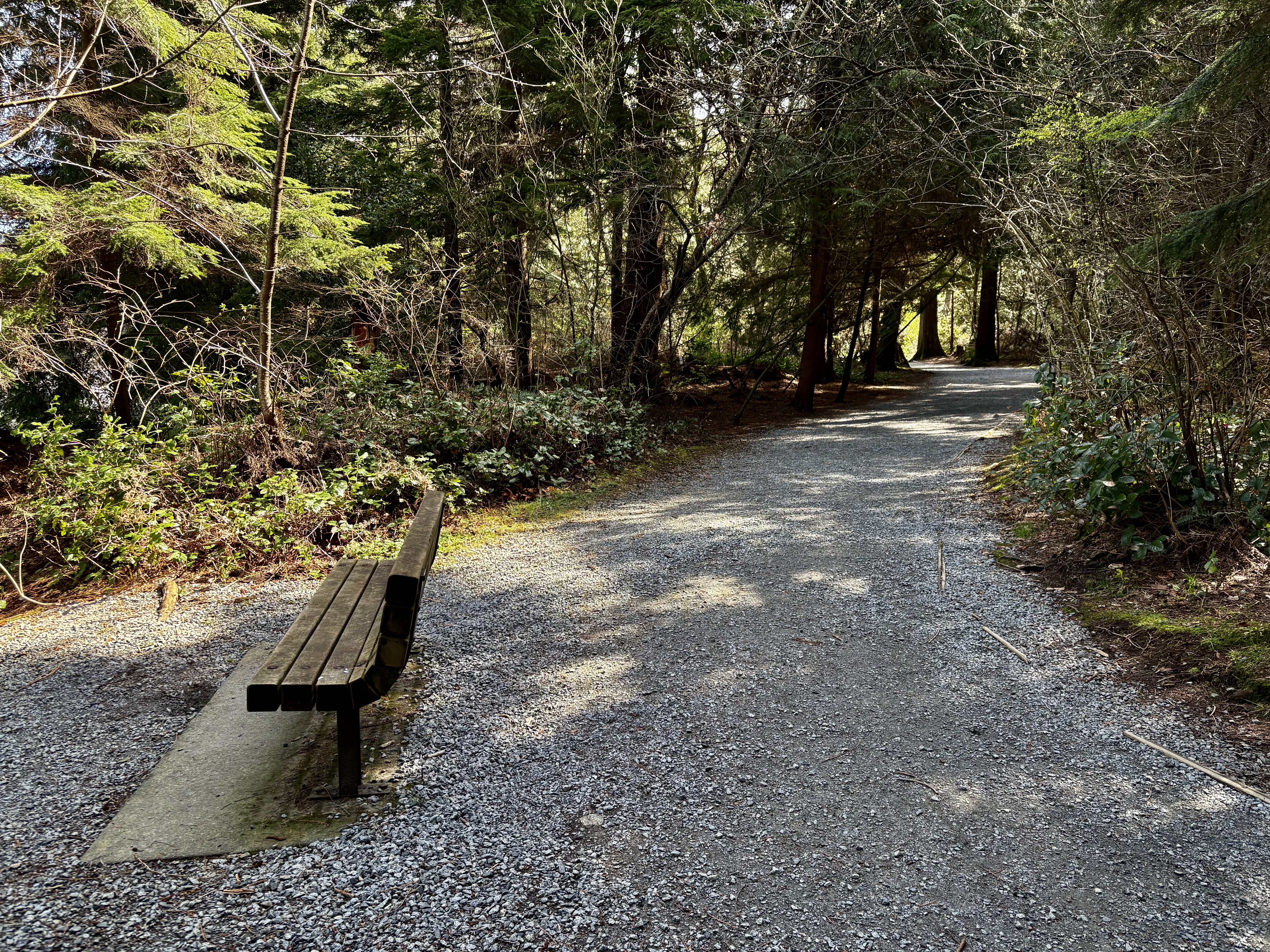 The pedestrian trail, separate from the biking trail, is gravel, liberally supplied with benches, and sometimes, as here, quite broad.