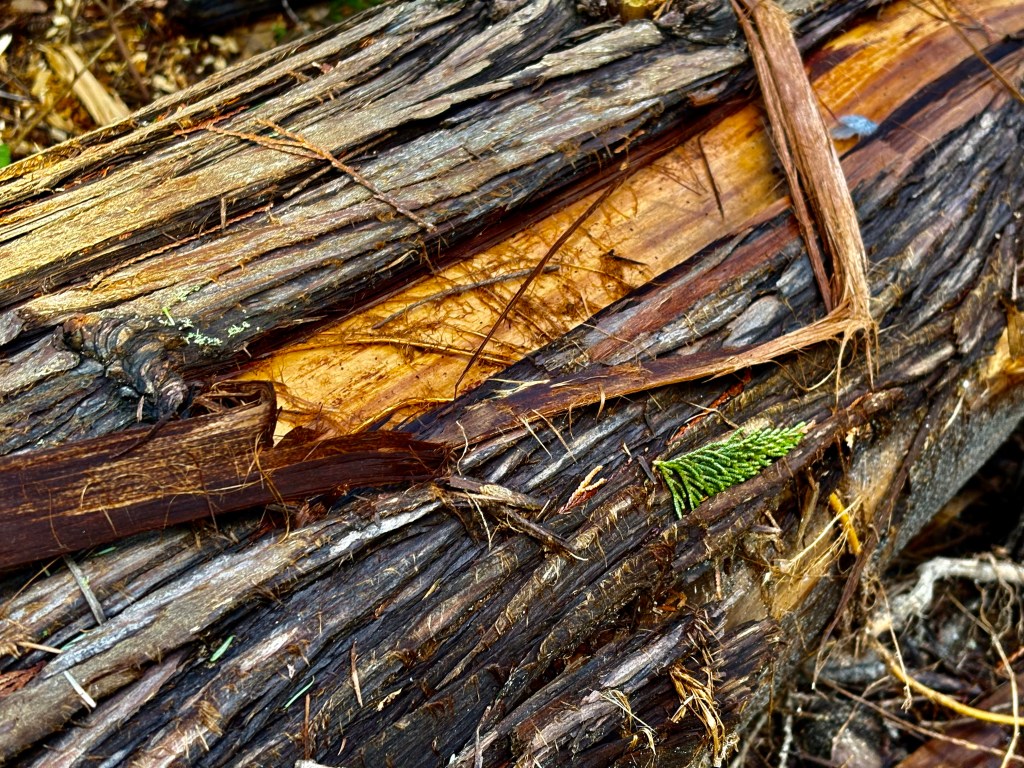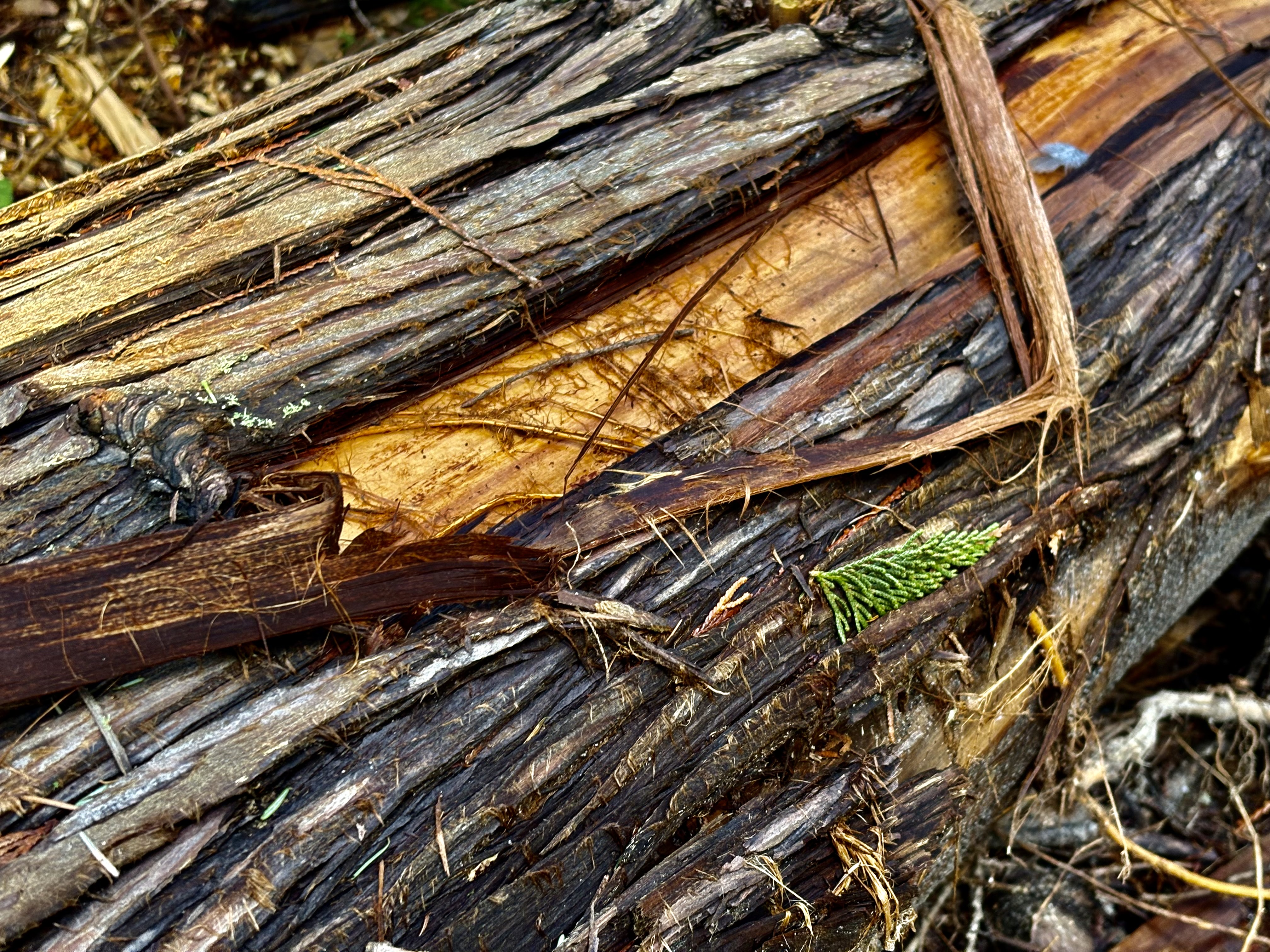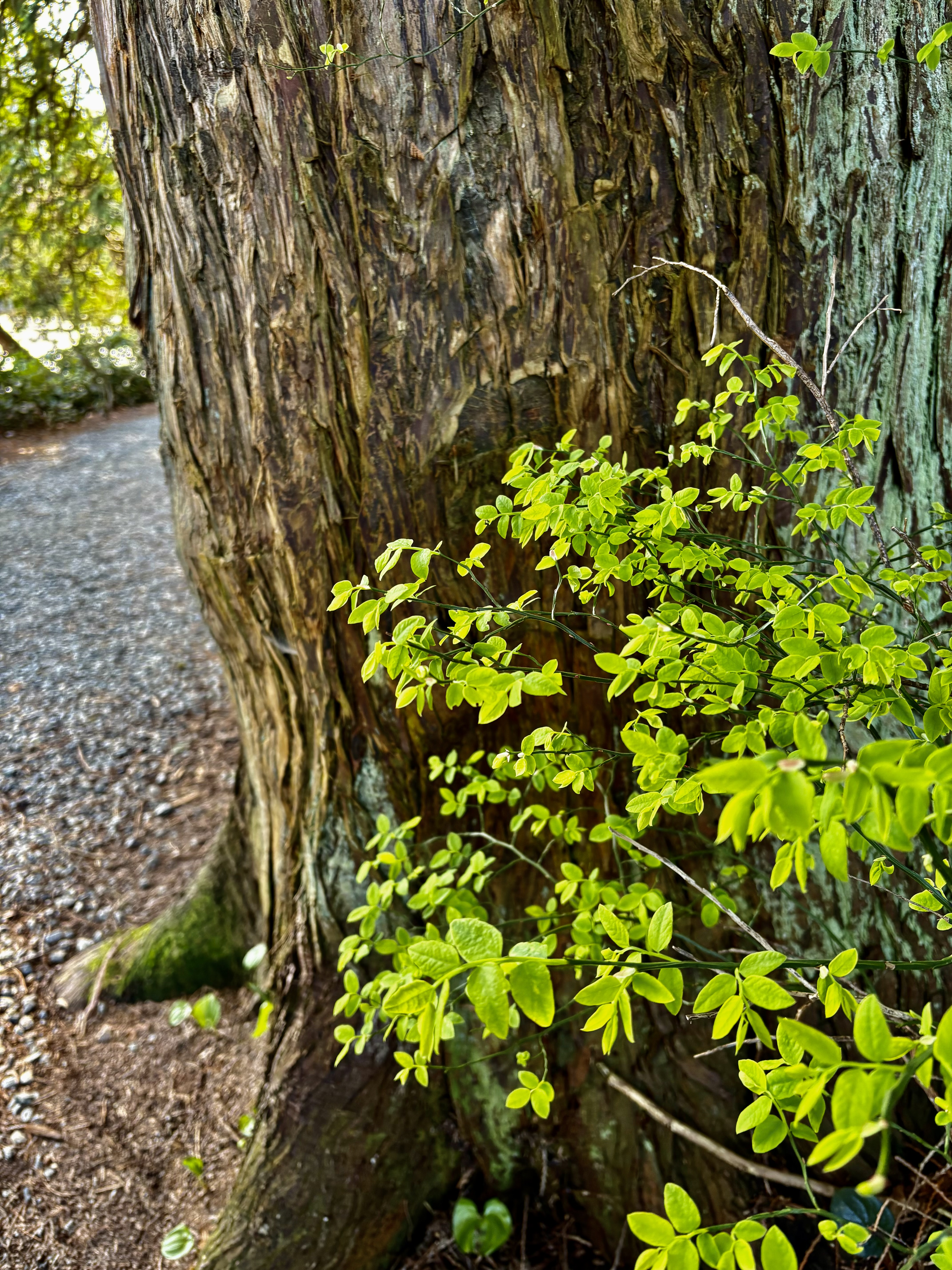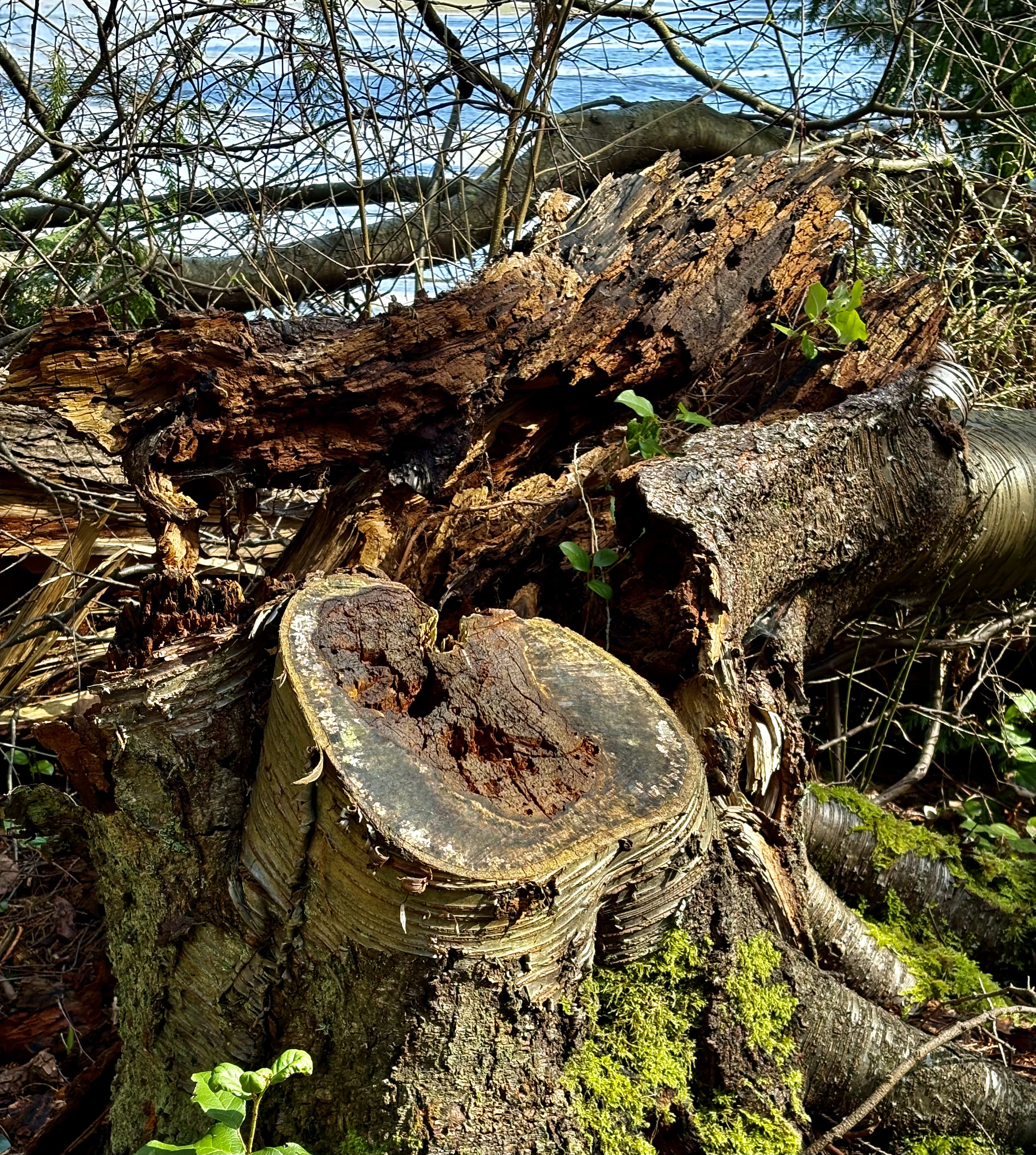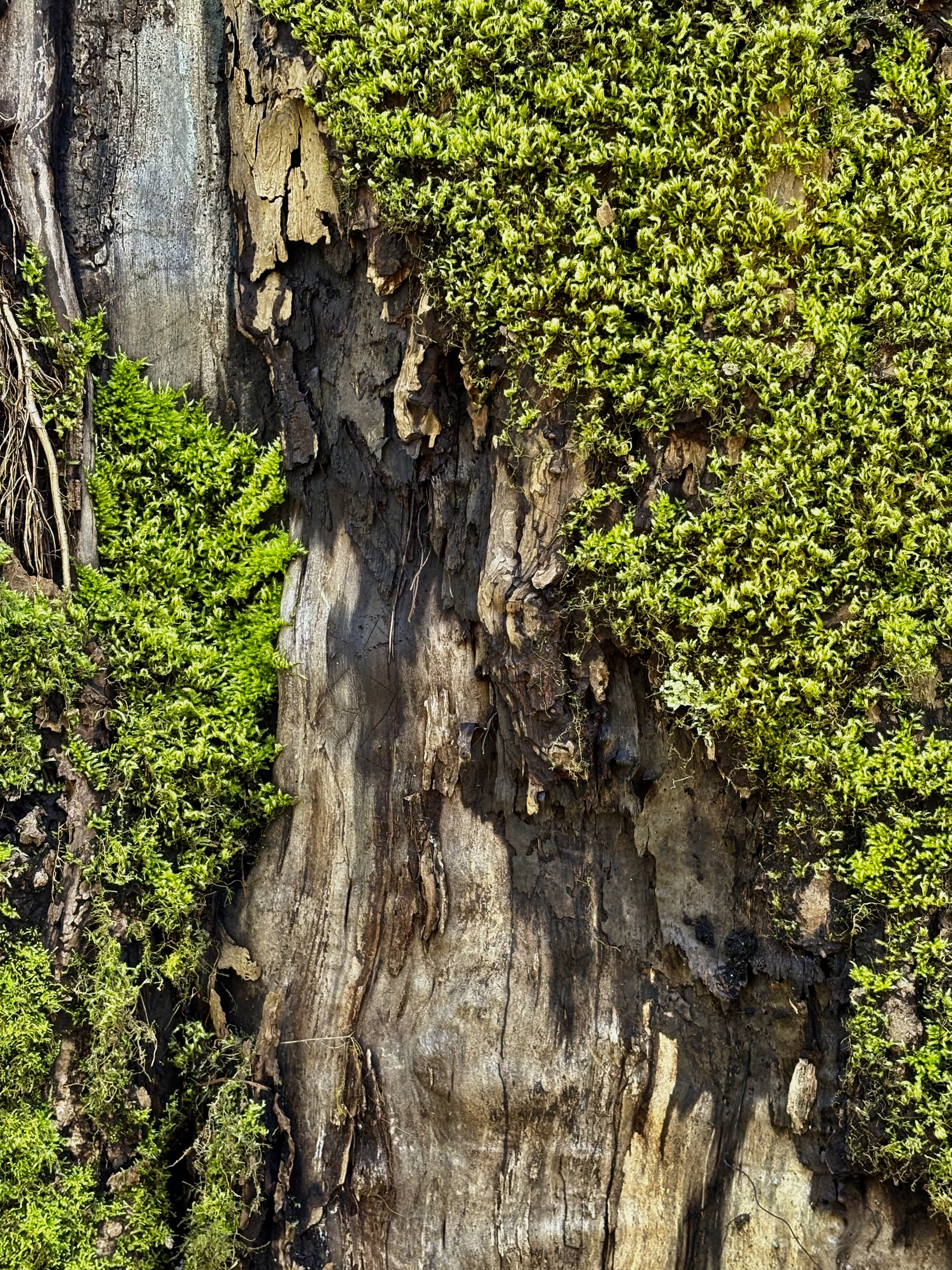When I’m not watching where I put my feet — an important part of “look low” — I’m giddy-stunned by the interplay of colour and texture. All around me, every level. This stump, for example, itself firm and crisply defined…