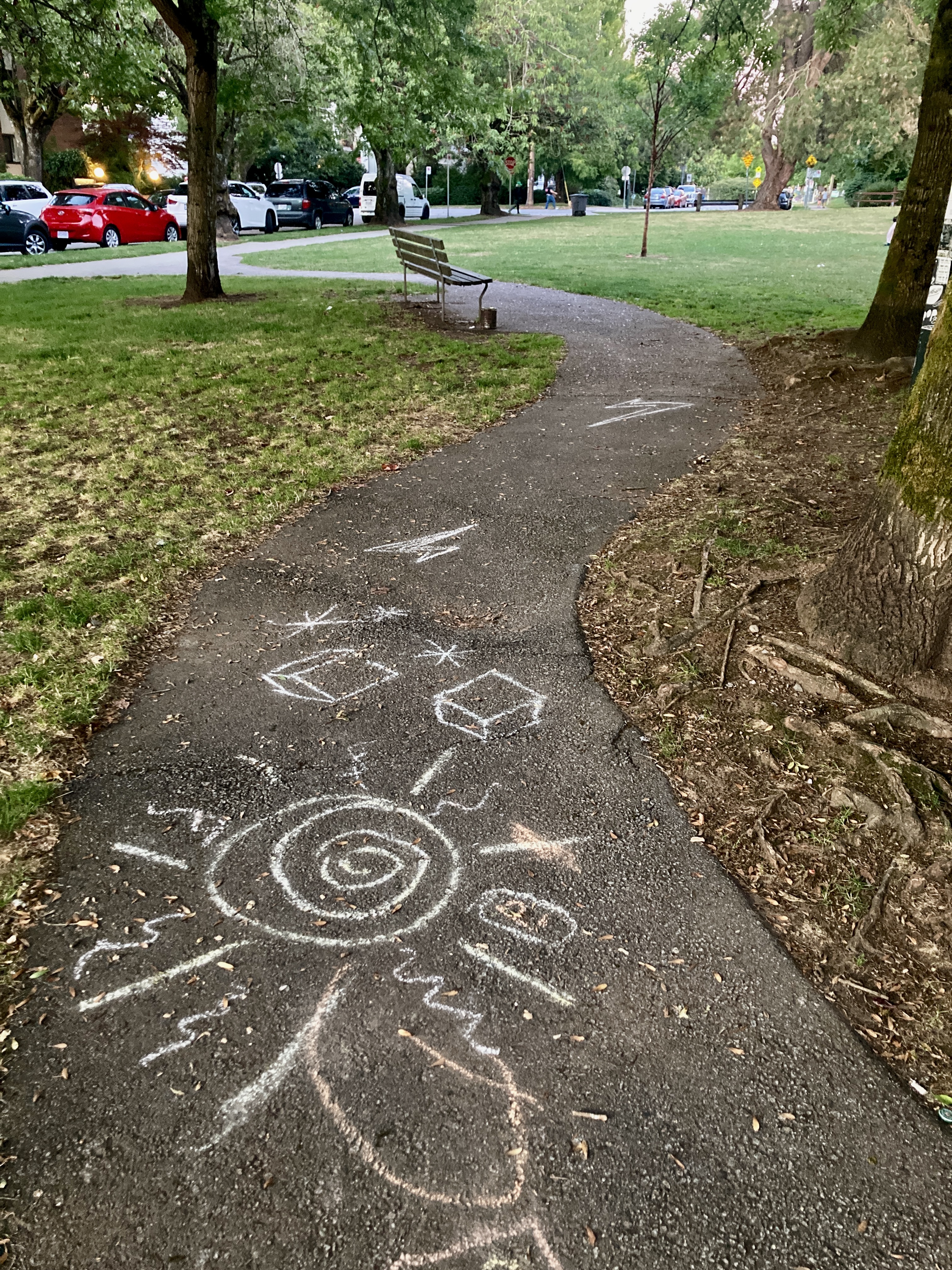 22 August 2025 – I mean to walk right through Dude Chilling Park, en route farther east. Instead, I stop to admire a brand-new hopscotch chalked into the park’s northern pathway.