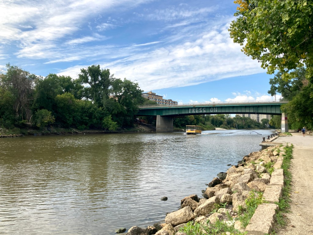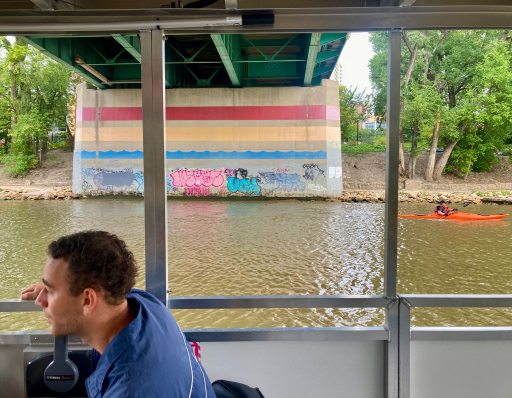 A tear-off map at my hotel inspires my walk: down to the Red River, there behind the Canadian Museum for Human Rights, and then along the walking trails up into Stephen Juba Park, back down and around the curve of The Forks (where the Assiniboine River joins the Red), onto the water in a 30-minute tour, and more river-side walking, both rivers.