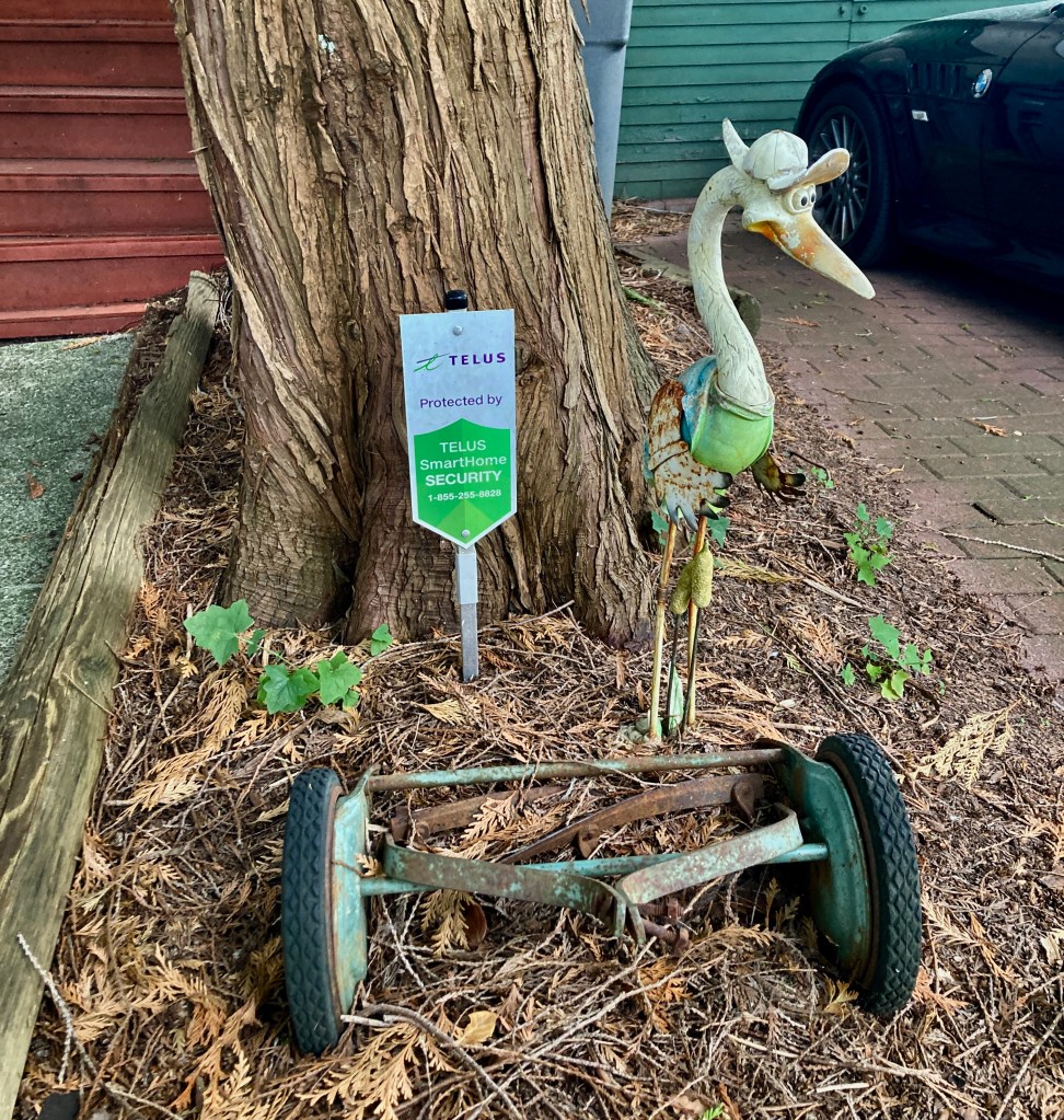 I’m headed in the opposite direction, north & west to the east end of False Creek. My route takes me past Mountain Equipment now-American-Company-not-Canadian-Coop. I consciously Don’t Go There; I instead enjoy the exterior of this mass timber building. Including the corvine slogan under one pillar’s footing…