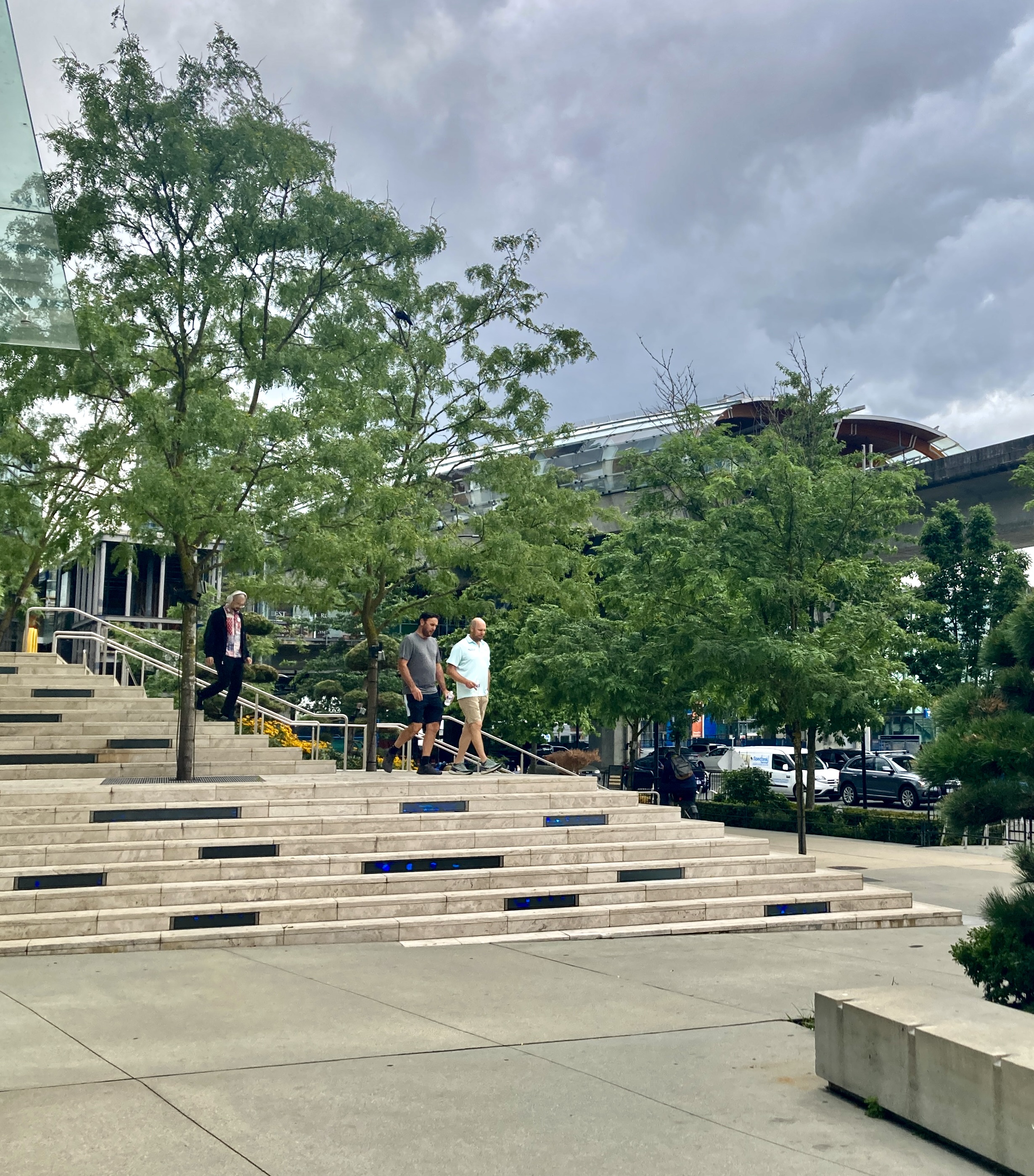 I’m headed in the opposite direction, north & west to the east end of False Creek. My route takes me past Mountain Equipment now-American-Company-not-Canadian-Coop. I consciously Don’t Go There; I instead enjoy the exterior of this mass timber building. Including the corvine slogan under one pillar’s footing…