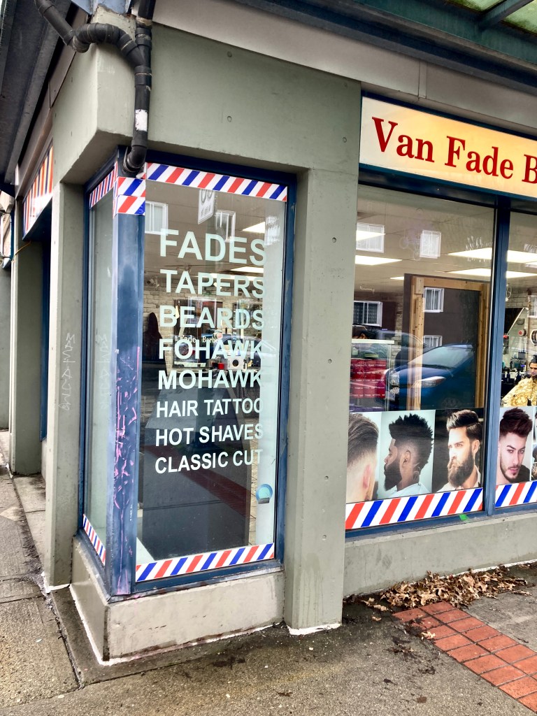 Fascinated as I am, I am not in the market for a fade. I’d happily be in the market for a latte, but unfortunately every café I pass is full up, so I head home.