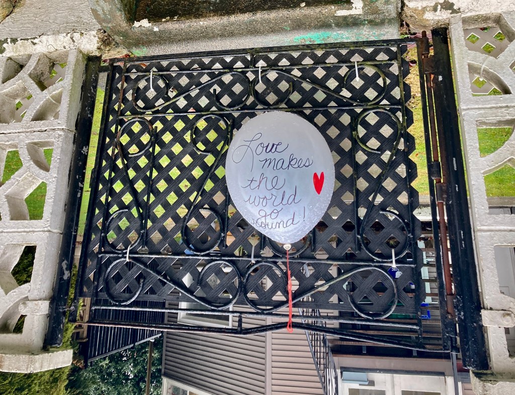 A nearby gate bears this balloon, with its optimistic and timely message…