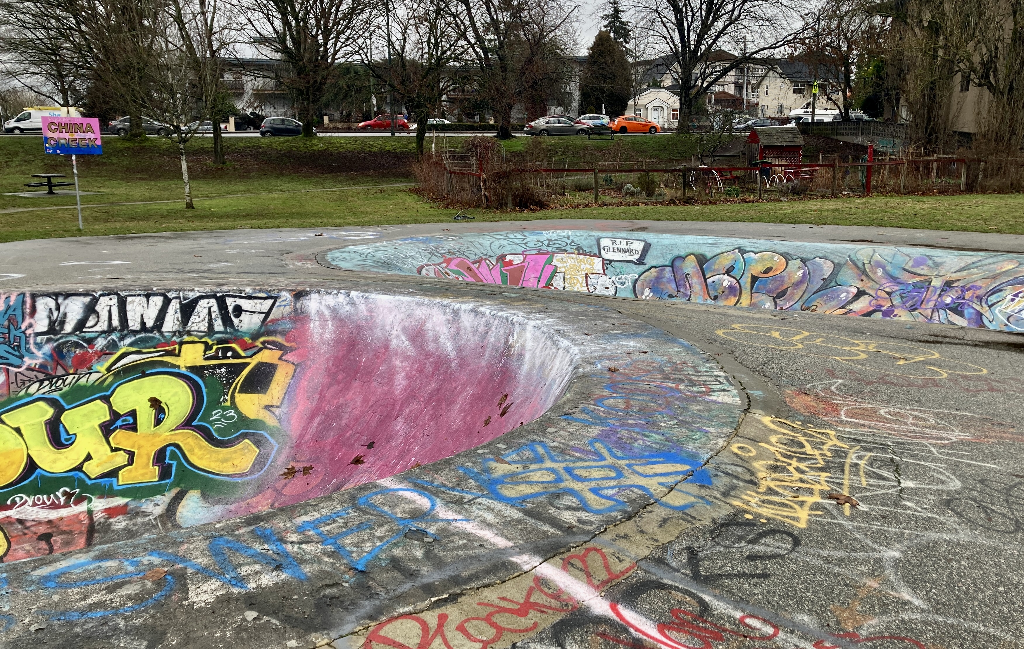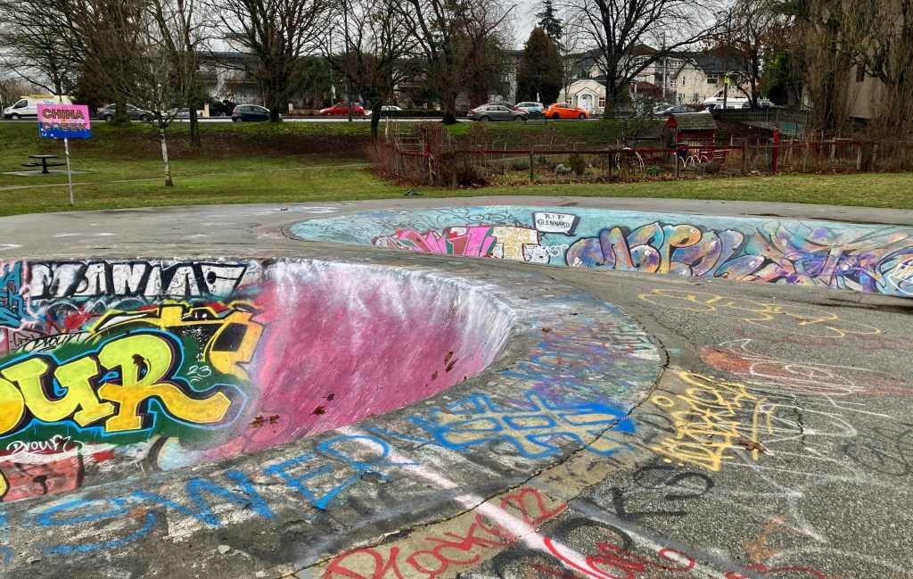 Messiness, no two ways about it, exuberant messiness is the calling card of any skateboard park — here the twin bowls in South China Creek Park near Clark…