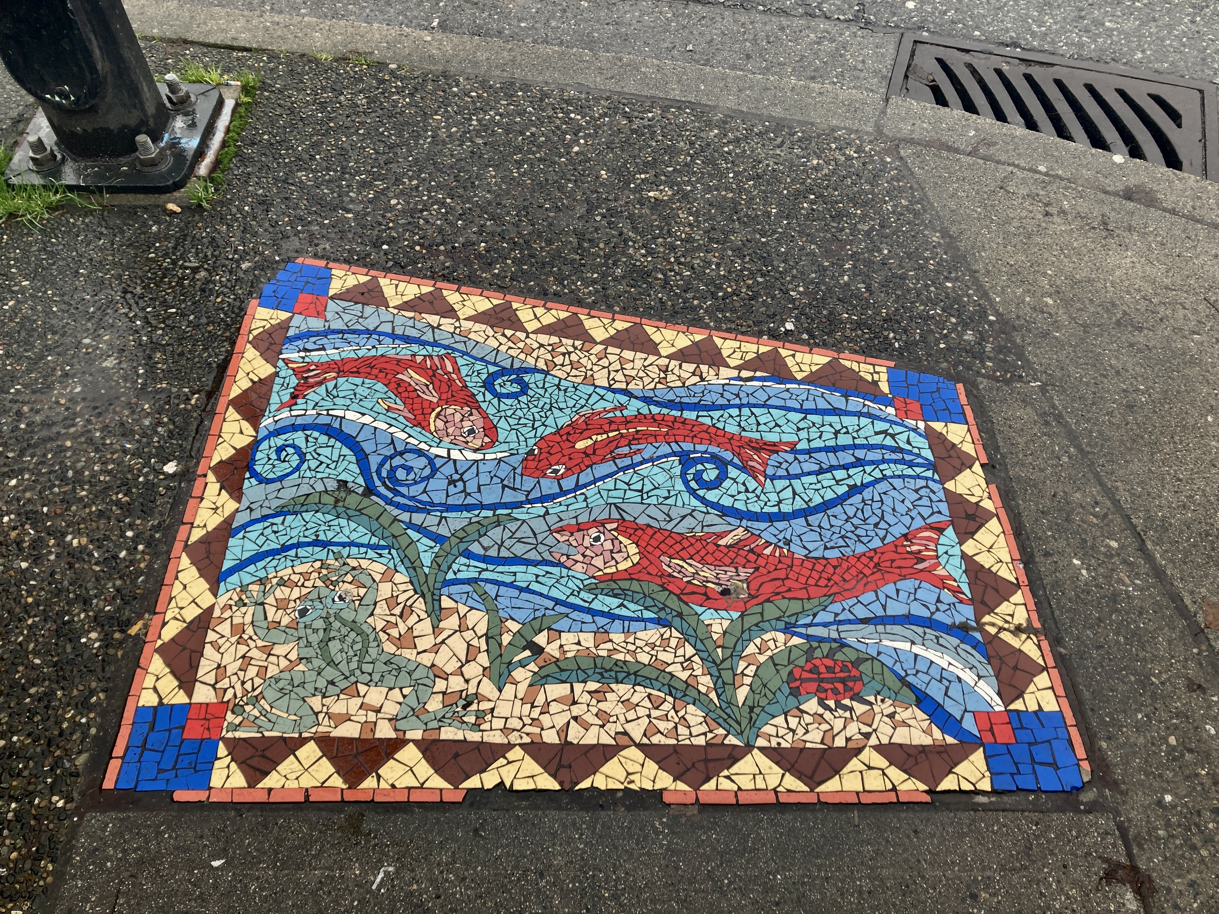 There are salmon (plus frog plus ladybug) in the sidewalk mosaic at Commercial Drive…