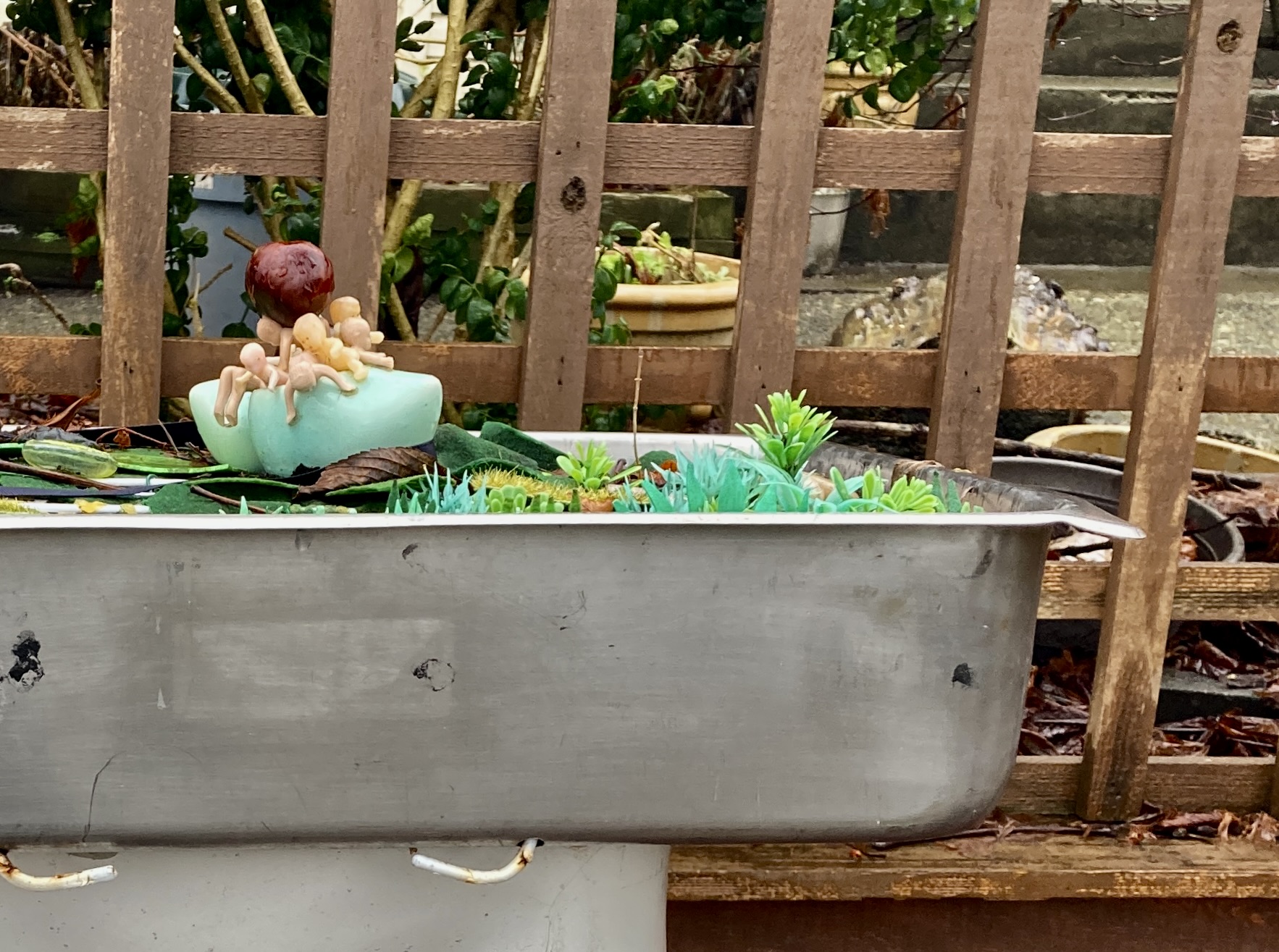 I am unsettled by this, feel my universe slightly creaking on its axis, and I am therefore relieved to see that the bizarre streetside attraction a few doors farther east is still in place. I’ve shown it to you before: a metal tub balanced on mannequin hips + legs, with assorted real plants and plastic ornaments — always including a clutch of tiny plastic naked babies, doing their best to escape from turquoise plastic clogs.