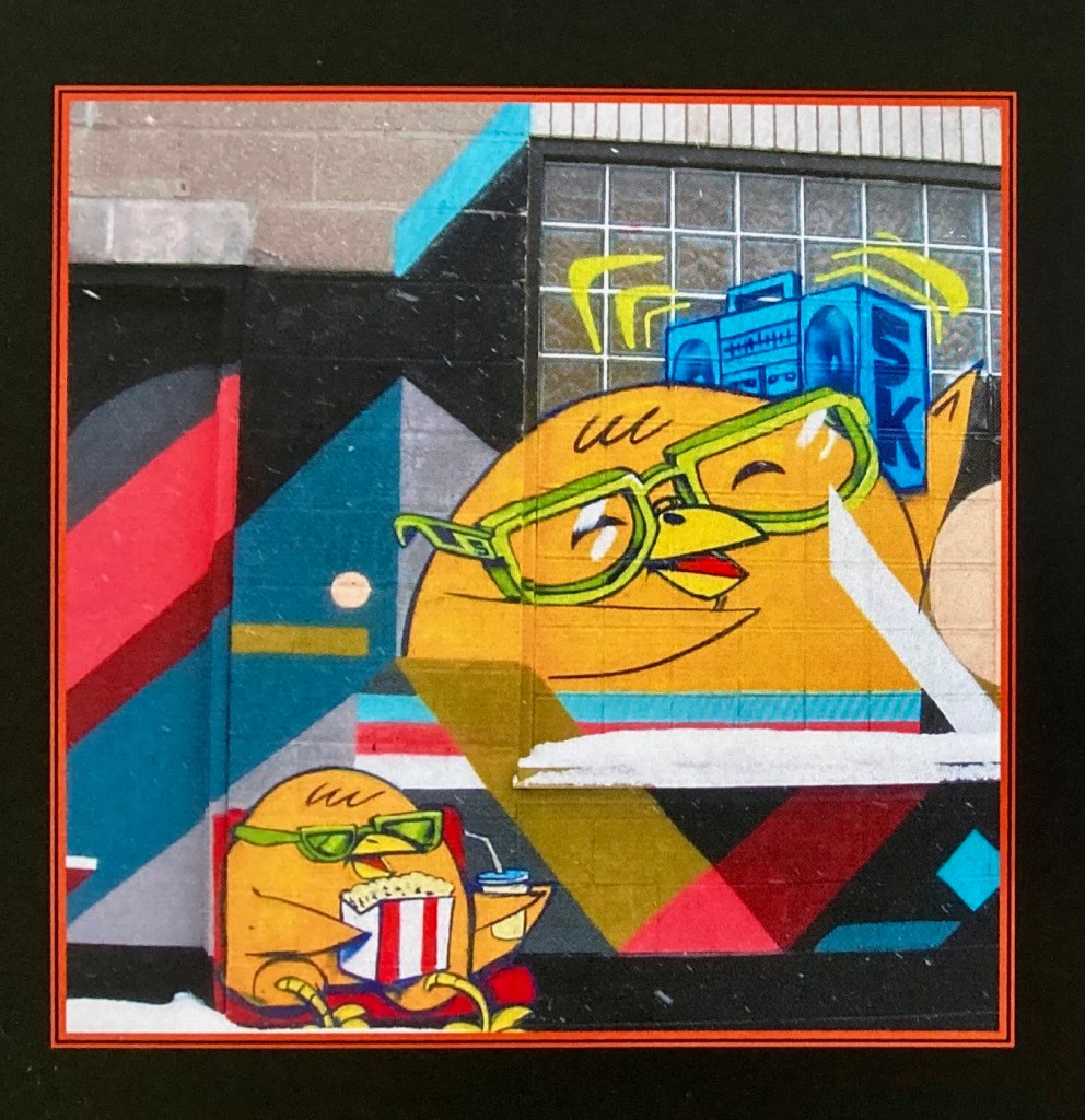 I circle the work, and also take in the larger view, including the top of an old mural by veteran Toronto artist Birdo, now obscured by newer construction and backed by even-newer construction.