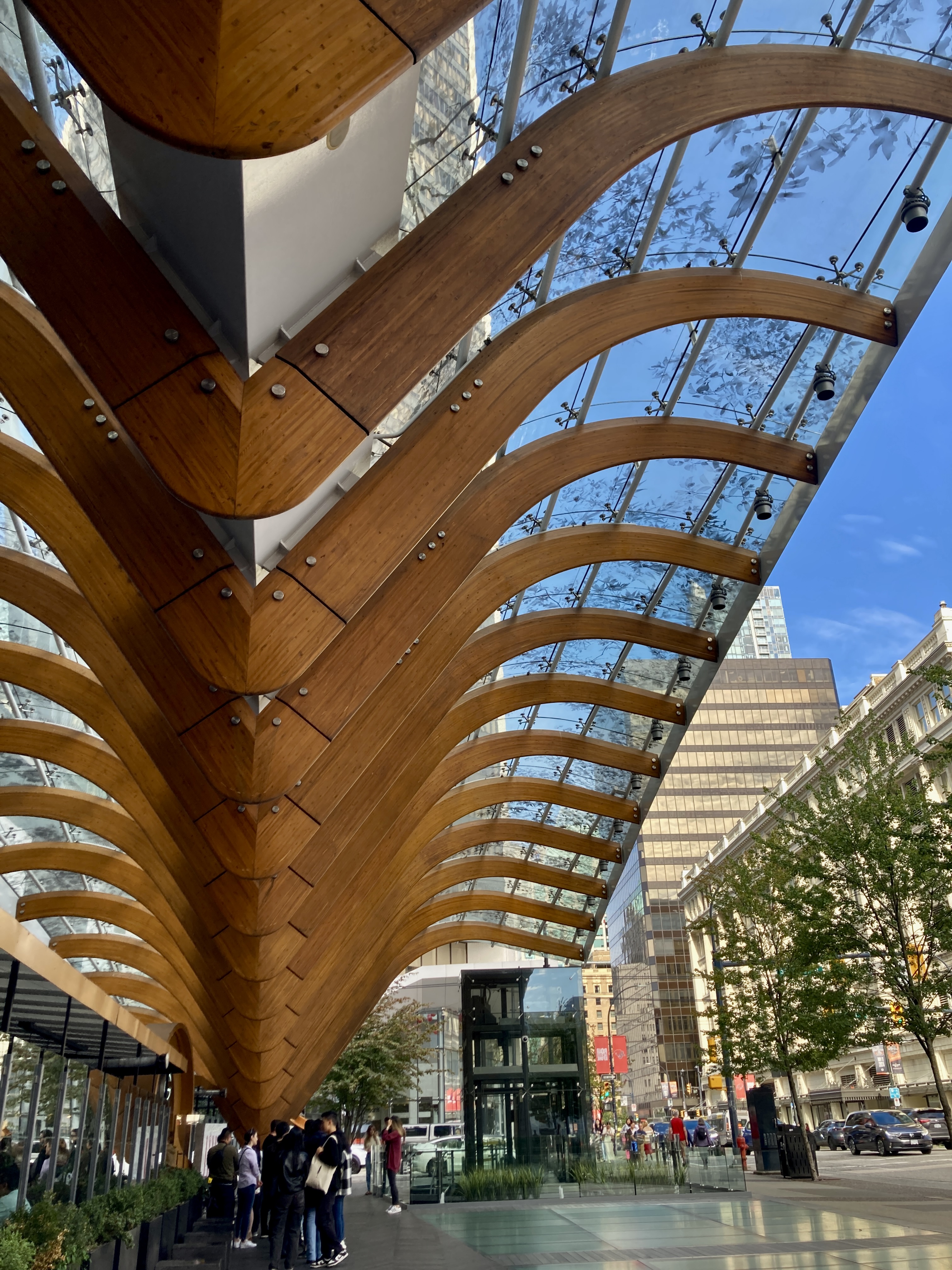 and, once inside, the soaring glulam arches of the AGO’s front-façade Galeria Italia.