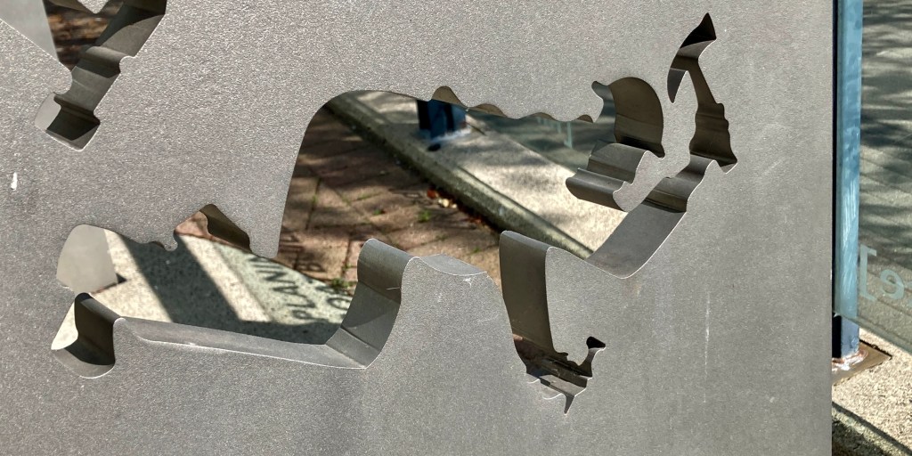 I check out the S/W corner of Dundas West & McCaul. It is also the N/E corner of the AGO footprint and, in my day, was still home to Moore’s Large Two Forms. For the first time, I see what now sits on that corner — Brian Jungen’s commissioned work, Couch Monster. (Read more, here, in a fine post by our WordPress colleague, Canadian Art Junkie.)
