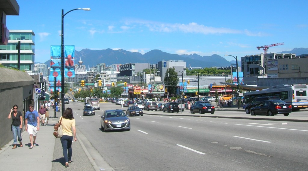 Soon I’m deserting this far corner of North Van for a visit to Vancouver proper — across Burrard Inlet by Seabus, then south on the Canada Line (built for the 2010 Vancouver Winter Olympics), and out onto Cambie St. at Broadway. Where I grabbed this shot northward up Cambie, sightlines back to North Vancouver and the framing mountains beyond.