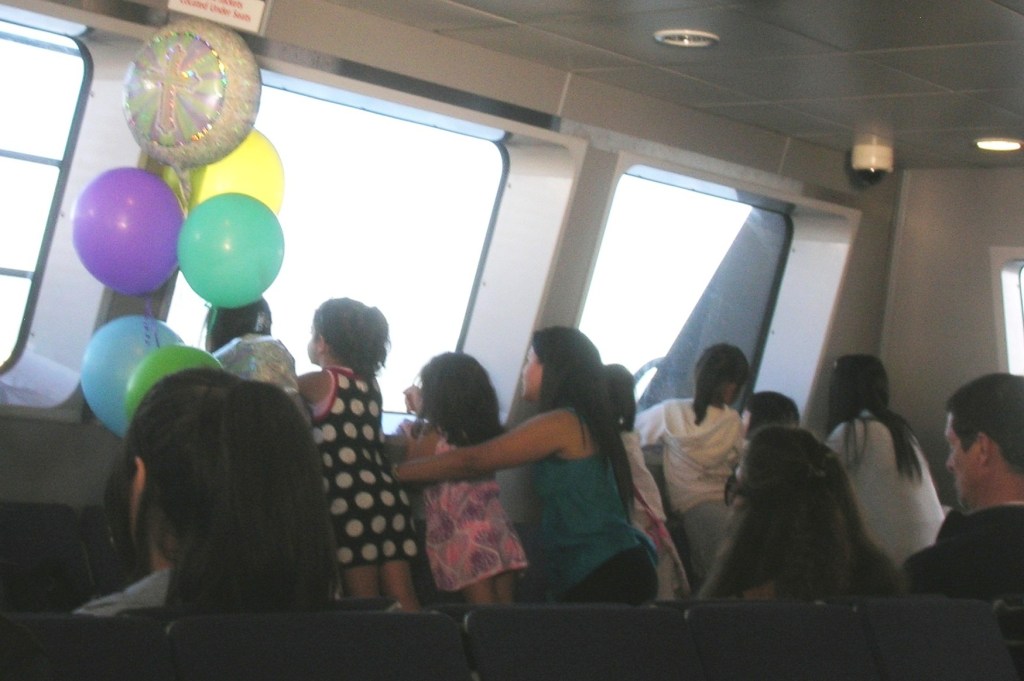 We had lunch one place, lattes somewhere else, prowled shops with strong design sense… and finally good-bye and back north I went, retracing my way via the Canada Line to the Seabus again. Where I was charmed by these little girls, their noses pressed against the ferry’s front window, party balloons to one side.
