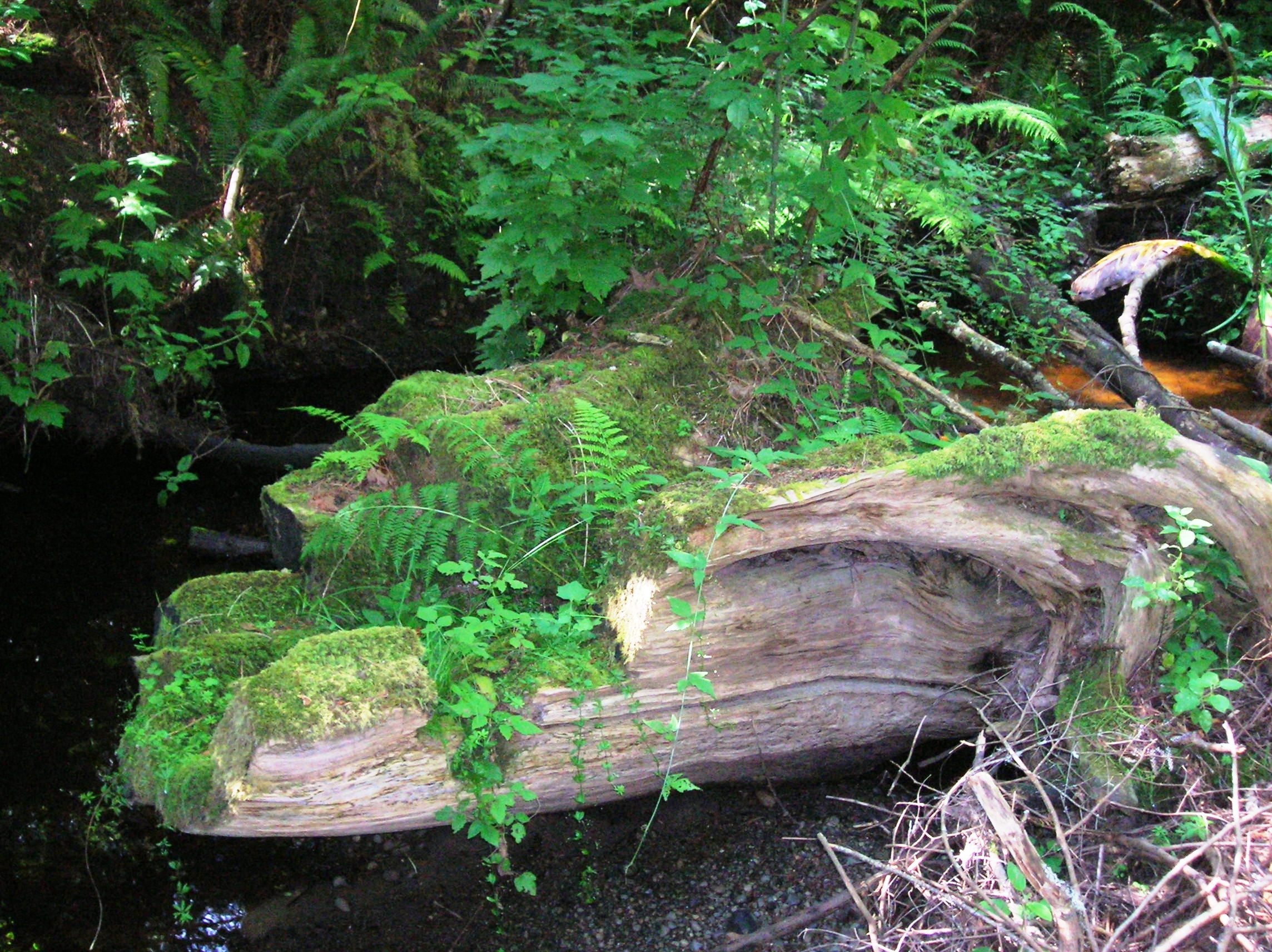 I took this photo of a “nurse log” right here in Watershed Park, but some years ago. Karen had explained the phenomenon to me, that of an old rotting log nurturing new life, and I remember being so happy to find such a good example of it.