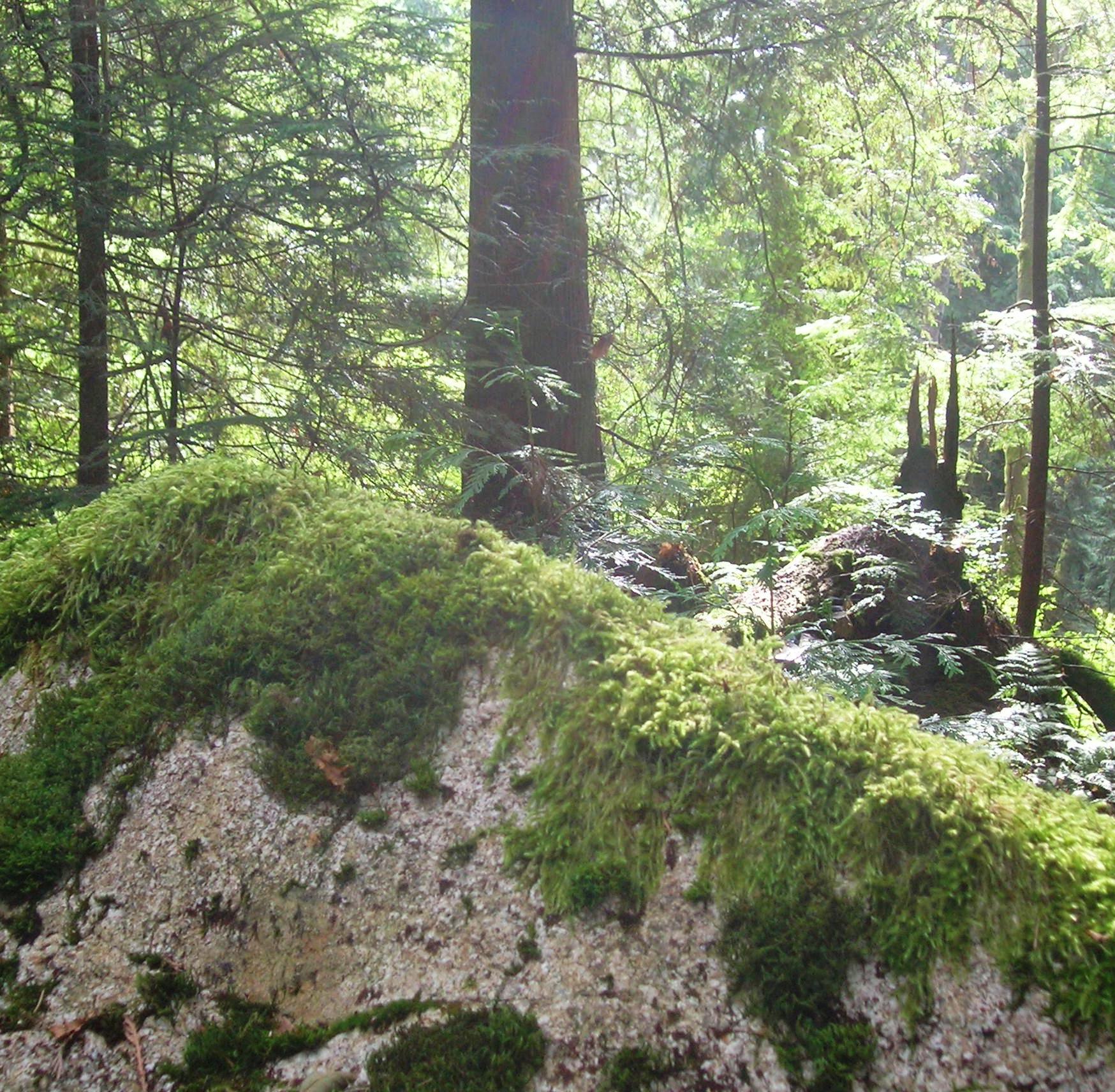 Then, sometimes, the elegant columns of trees give way to great bursts of nature’s very own mixed media: rock and moss and other layered vegetation and spikey remnants of old logs and forest, forest, forest.