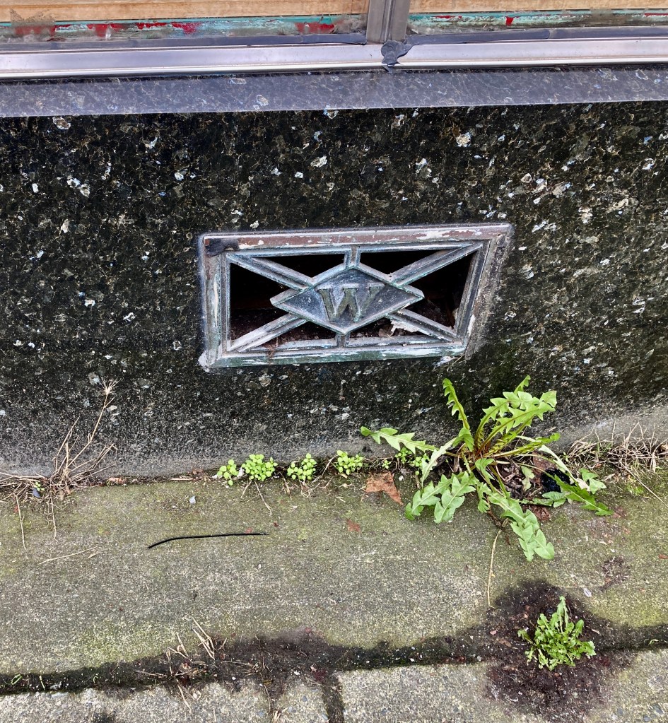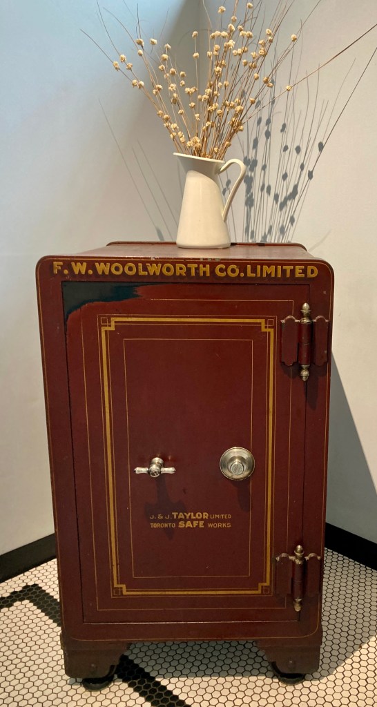 And so, out for a walk today, I follow the “W” story to its other artefact, the safe in its new home. Once functional in a five-&-dime, it is now purely decorative in an artisan bakery, and looking very charming it is, too.