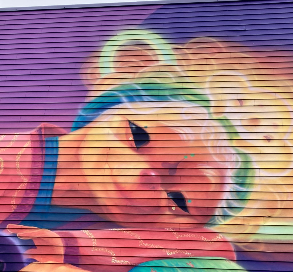 Though Abraham doesn’t say so on his own website, I was told during a VMF art walk that the characters shown on that busy wall reflect local characters and are a tribute to those characters and all the other neighbourhood legends.