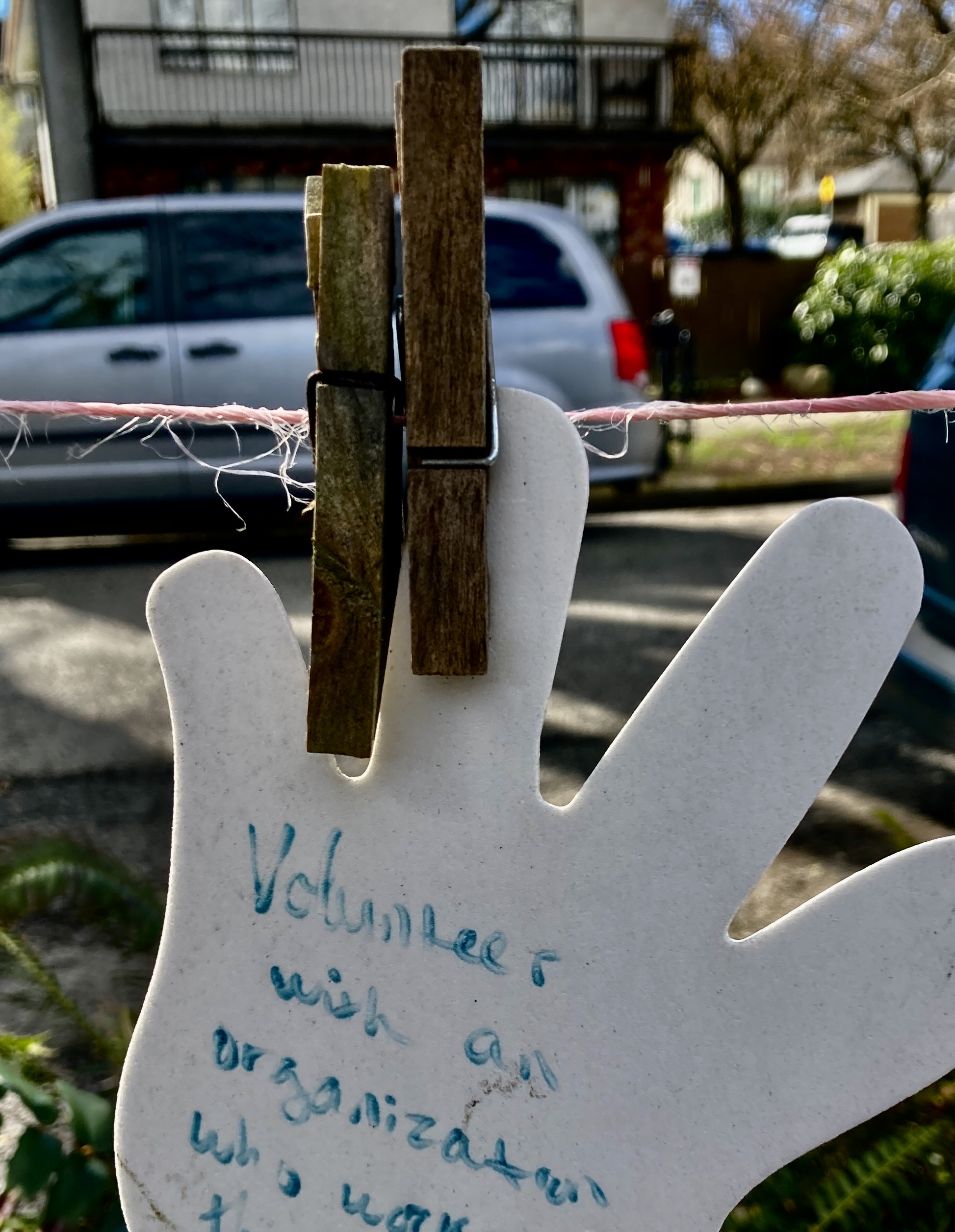 The mood dictated by this current theme is helpfulness: suggest an activity or an attitude that will help you, your community, the world. Write your helpful idea on one of the hand outlines provided, and peg it up for all to see.