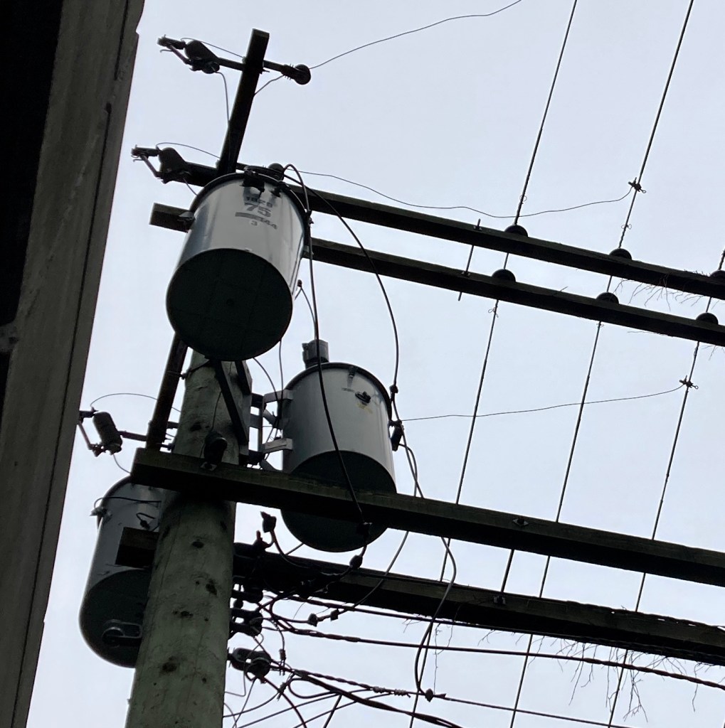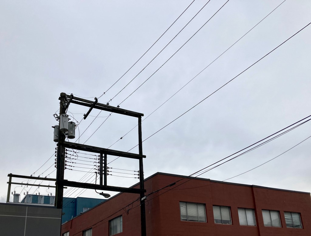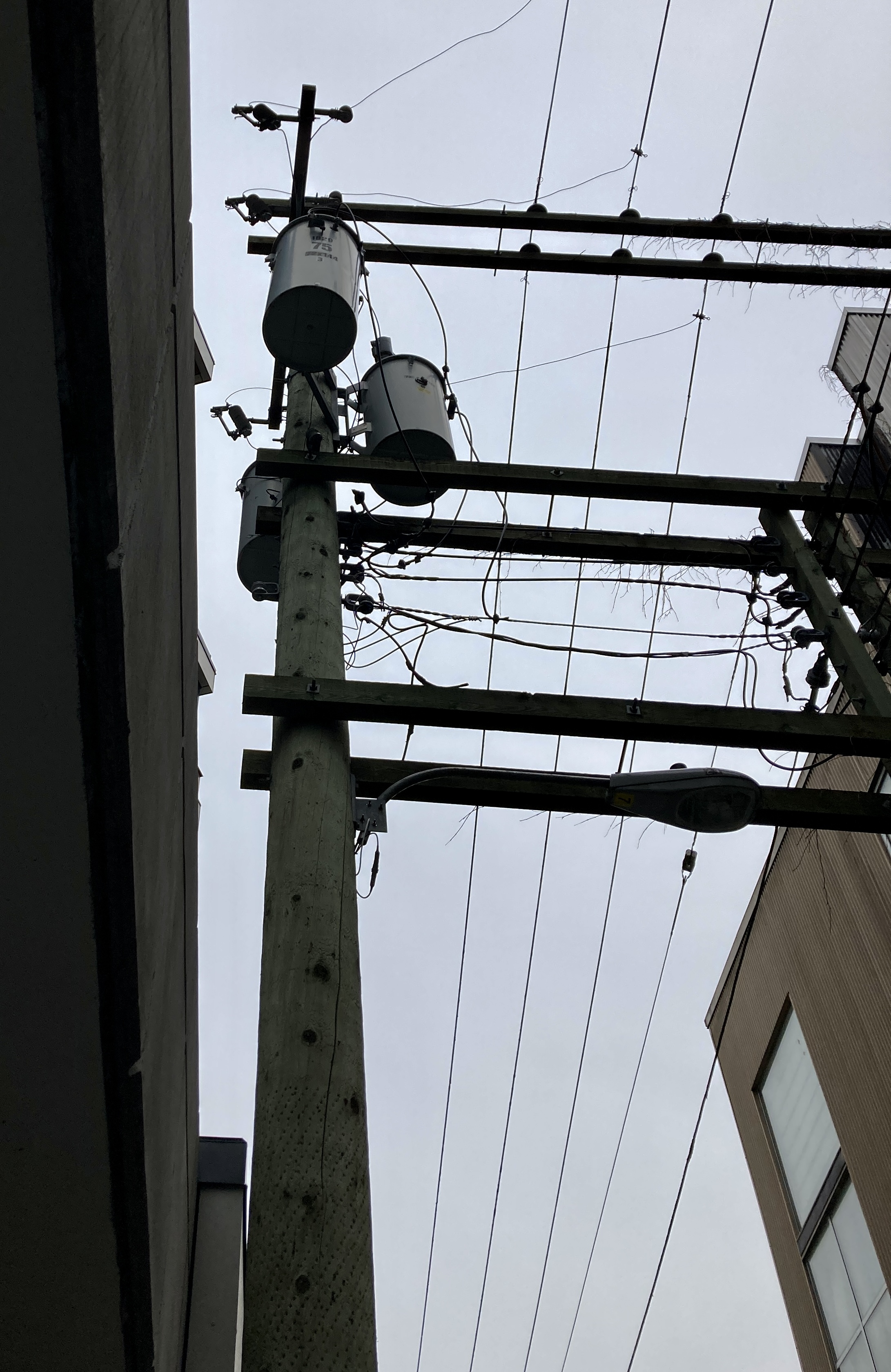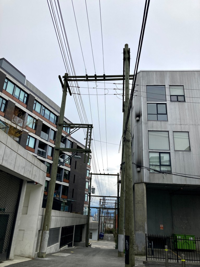On Friday, heading north-west down an alley, my enjoyment is distinctly vertical. I’m captivated yet again by a line of H-frame hydro poles.