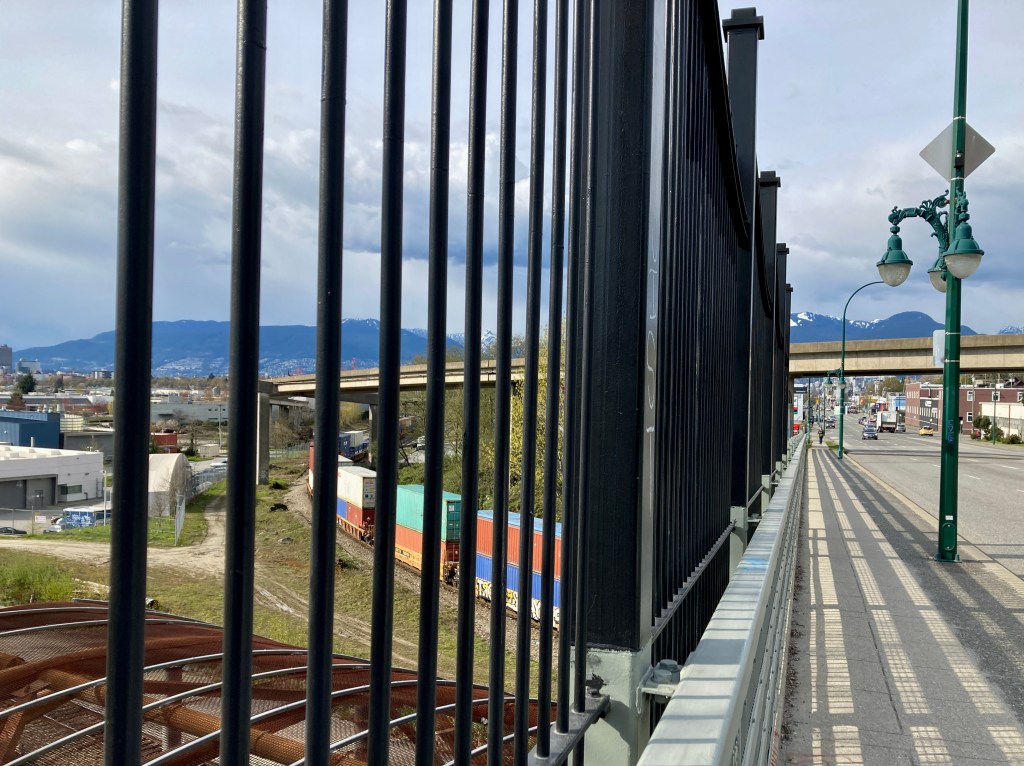 Below to my left, protective arched screening over the Millennium Line tracks, beyond that railway tracks with all those colour-block shipping containers rolling past; straight ahead, only slightly upwards, the Expo Line as it crosses Clark; and ‘way beyond that, very up indeed, those Coast Range mountains.