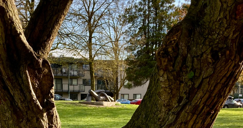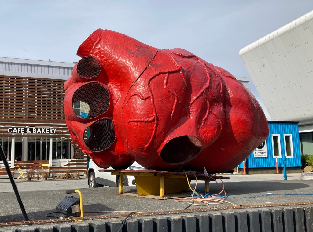 Just east of the university, in front of the Digital Media Centre, I literally do a 360 review. First, I am in front of this striking red heart. Striking, but awkward in its placement.