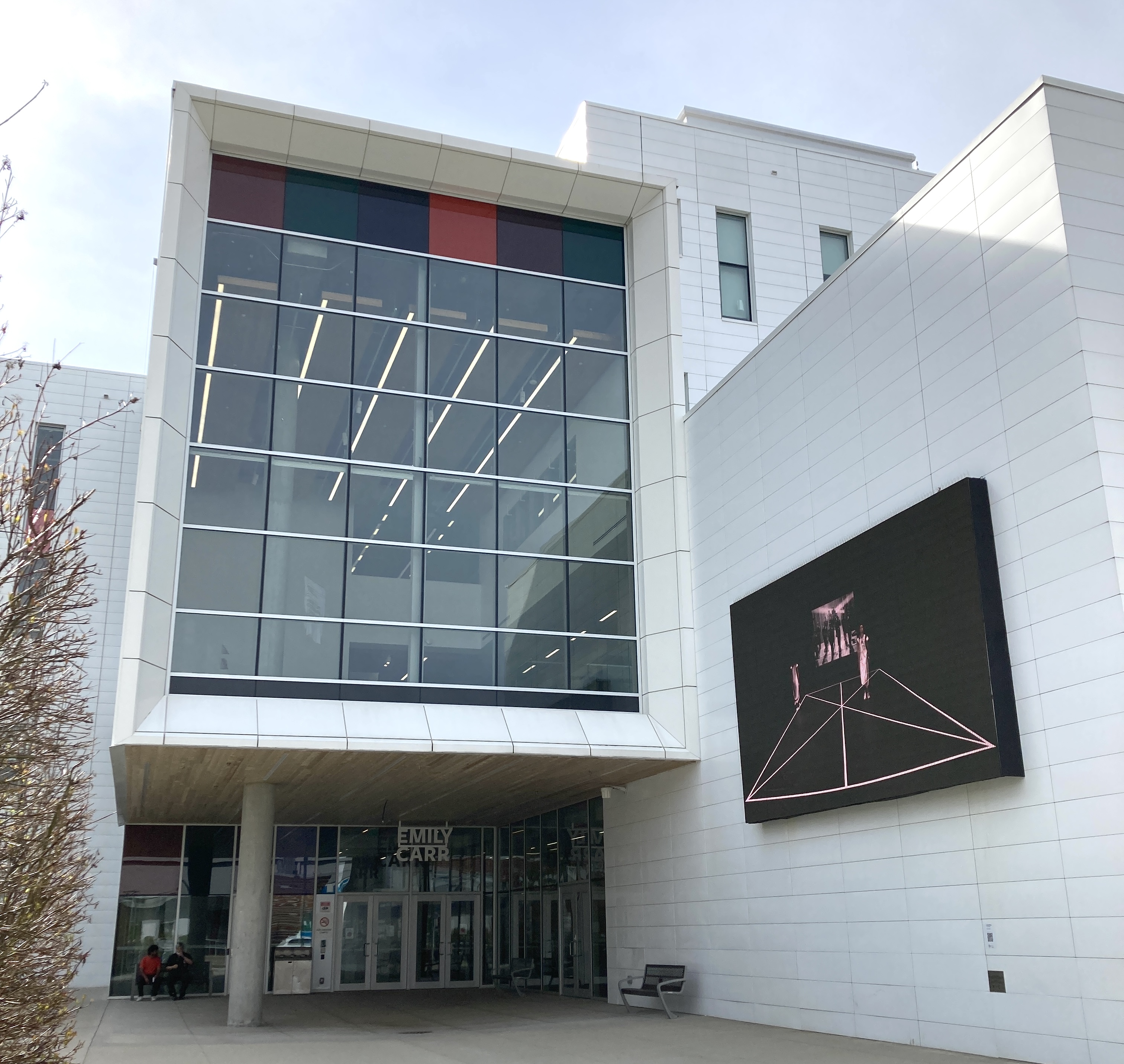 From eyes down to eyes up, as I pass Emily Carr. Skateboarders are clacking away on an unseen obstacle course to my left, while Kandis Williams’ Triadic Ballet silently unfolds on the wall screen to the right of a building entrance.
