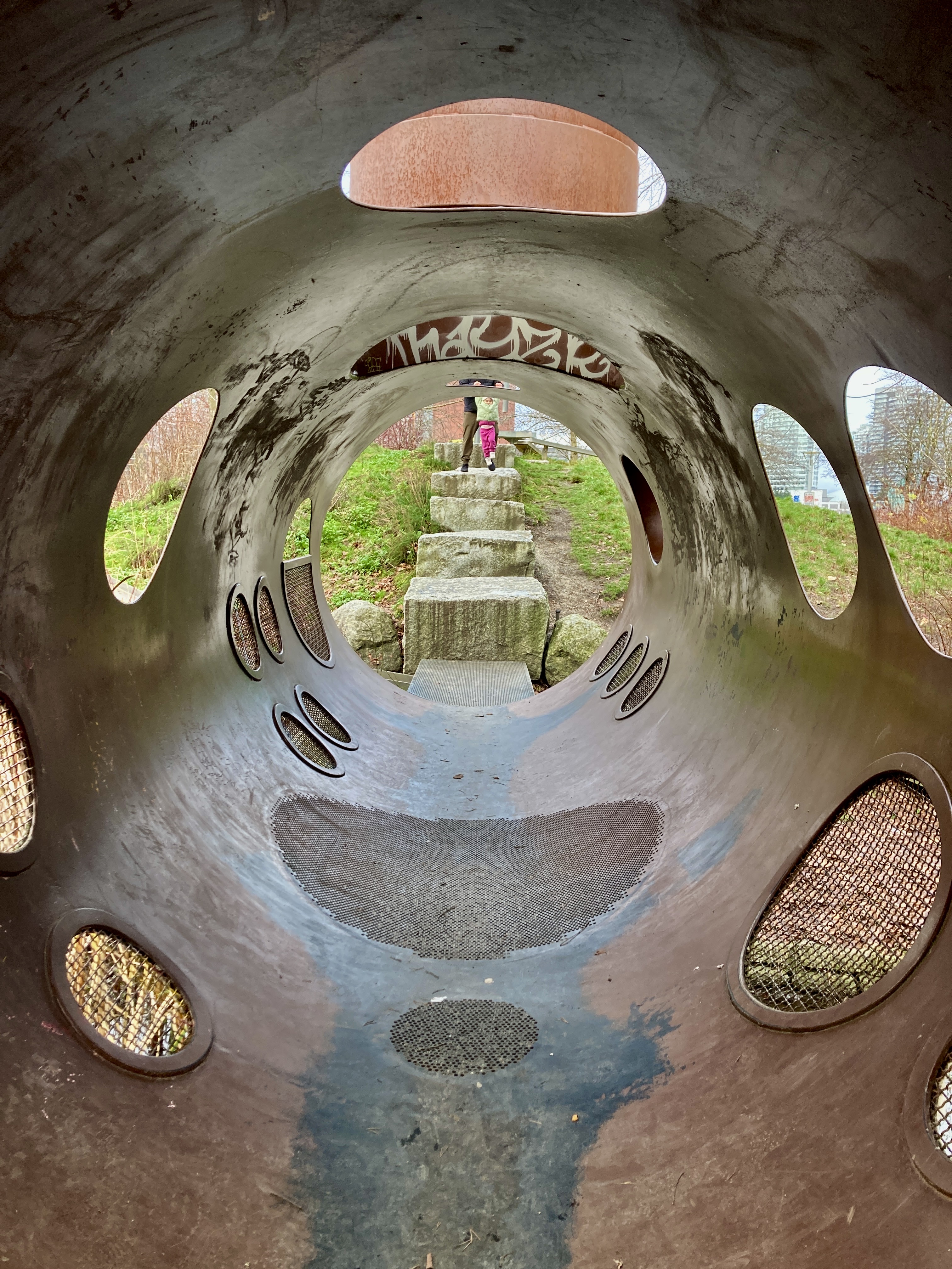 As I follow that False Creek tributary through Hinge Park, I come to the playful little bridge connecting one side to t’other…
