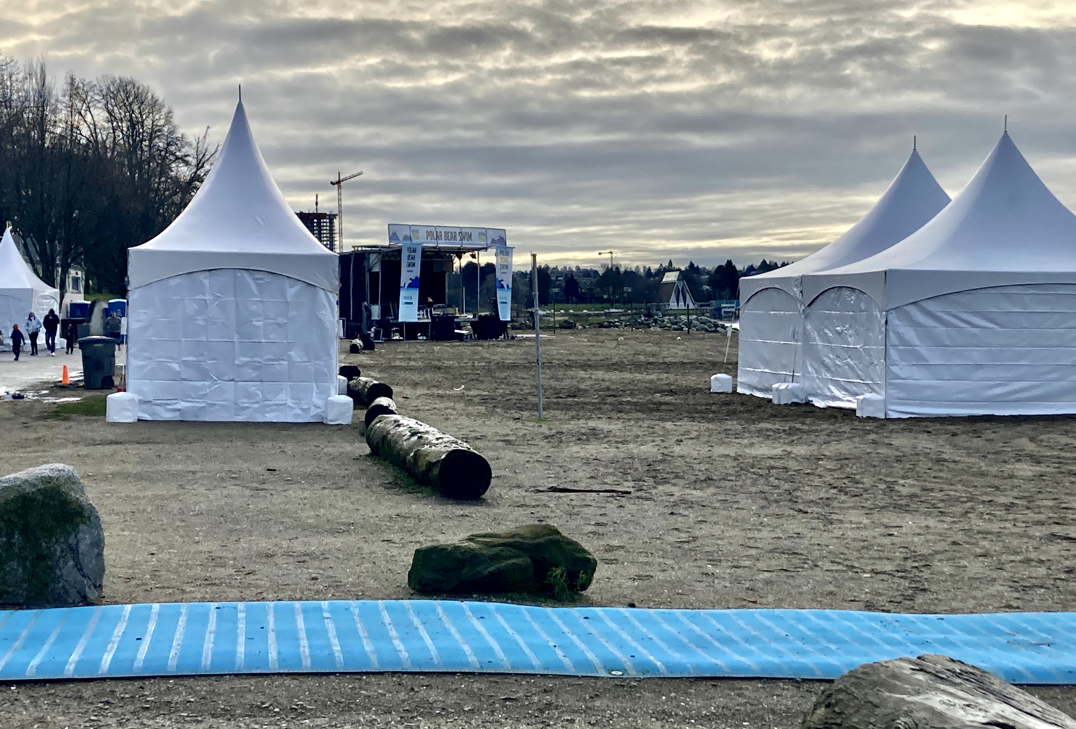 Yesterday, after my own get-some-exercise walk through Stanley Park and back toward town from Second Beach, I see this cluster of tents set up on the shores of English Bay.