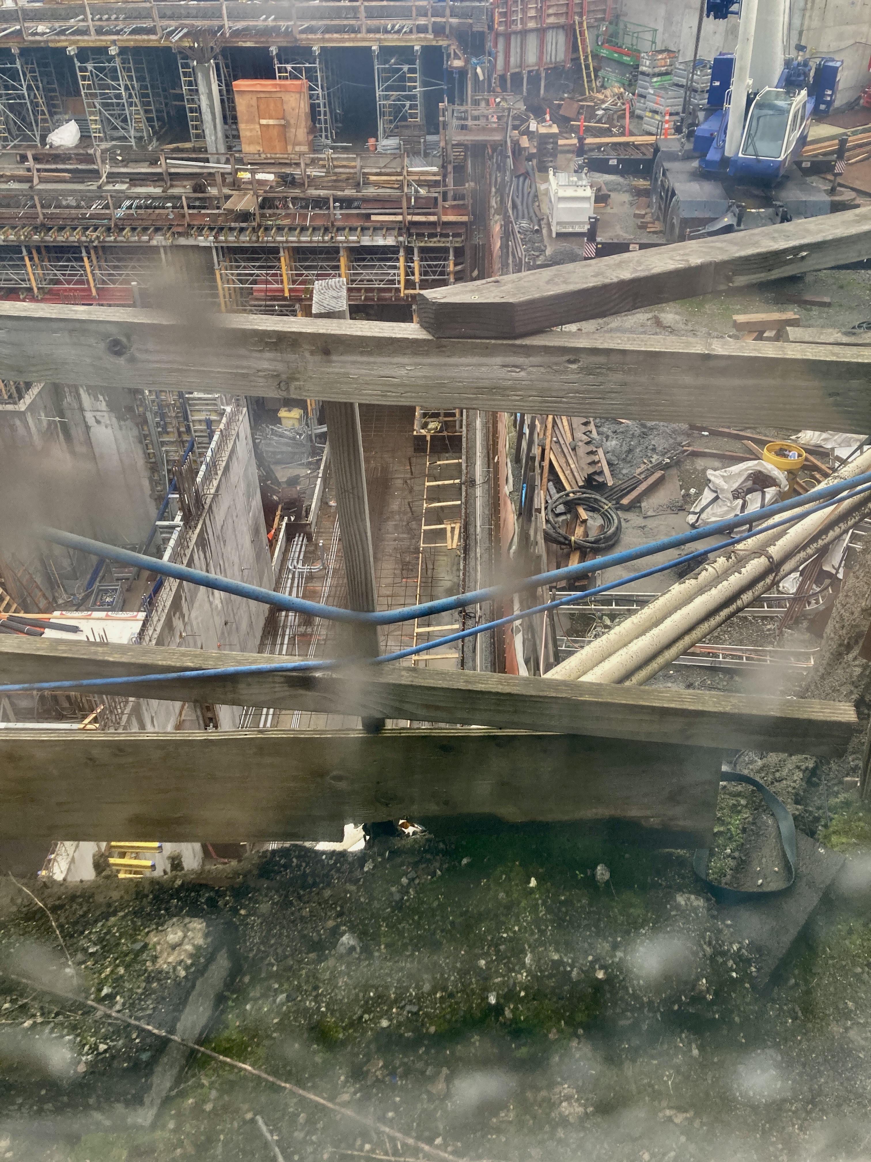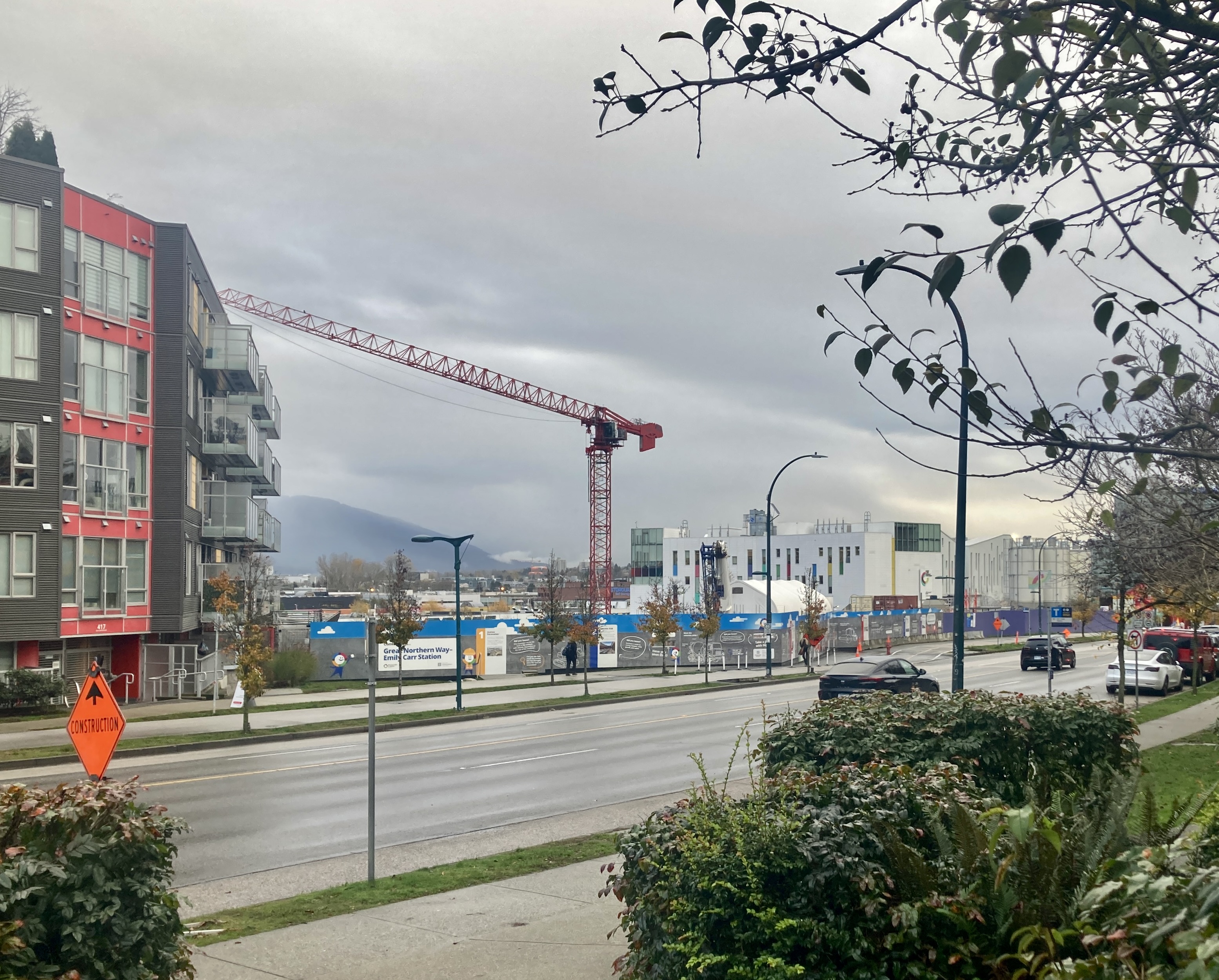 And, in between, the work-in-progress GNW Emily Carr transit station, with its hoardings and bouncy signage to explain what’s happening, along with viewing slots so you can see for yourself.