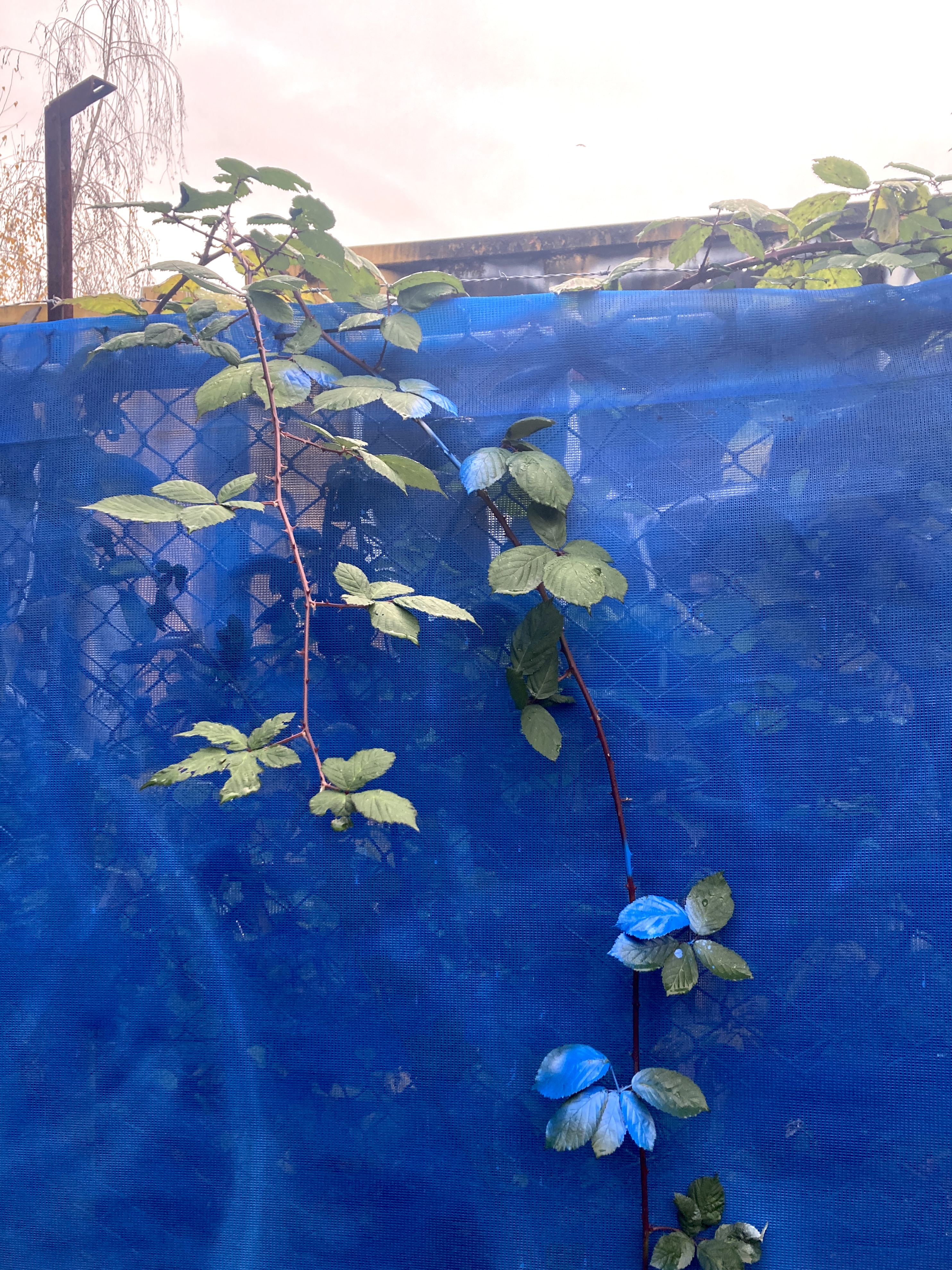 Nature likes chain link fence, vines especially, they climb all over it. Even when the fence is mostly draped in bright blue tarpaulin. Vine still finds a way.