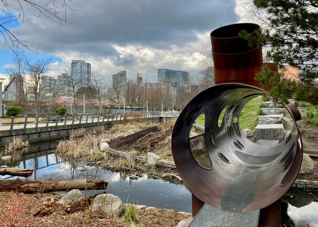 Like them, I turn west on Switchmen St. — a necessary detour while the end bit of Seawall is under repairs — and, from my vantage point at Pullman Porter, watch all those yellow & green T’s double ’round the parking lot & veer back east toward the geodesic dome of Science World. (An aside to you: you have noted these further railway tributes? Of course you have.)