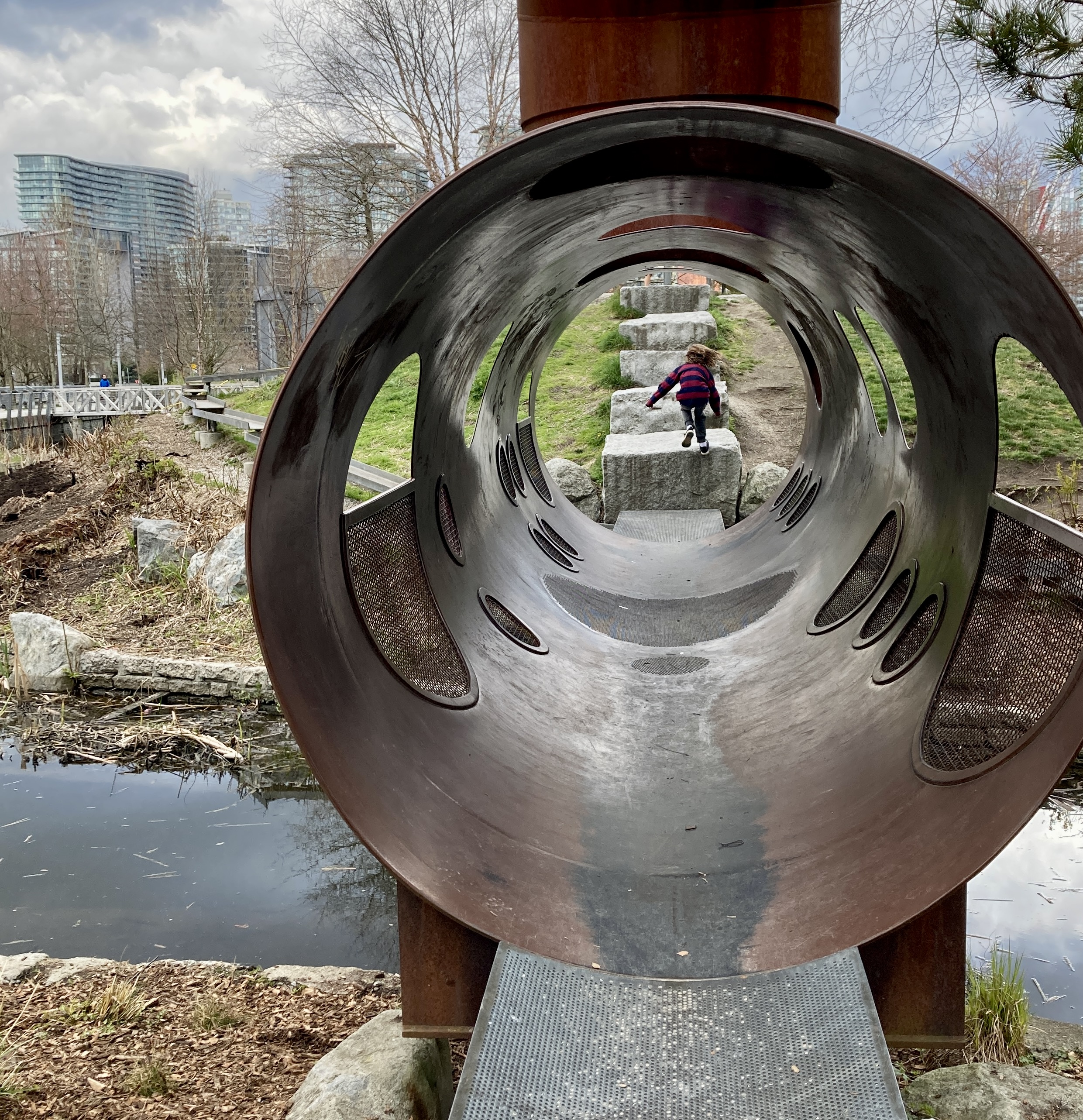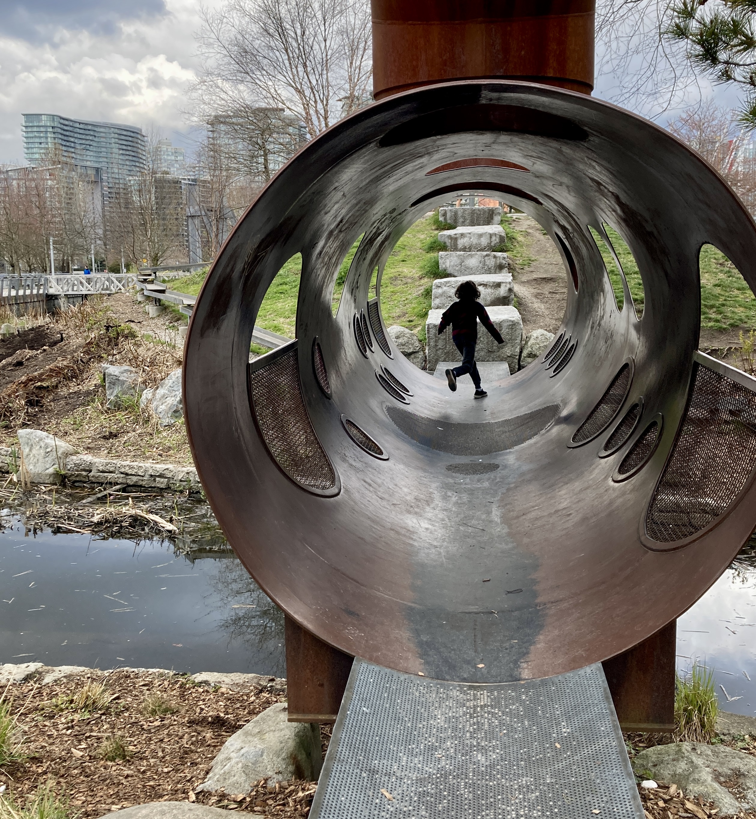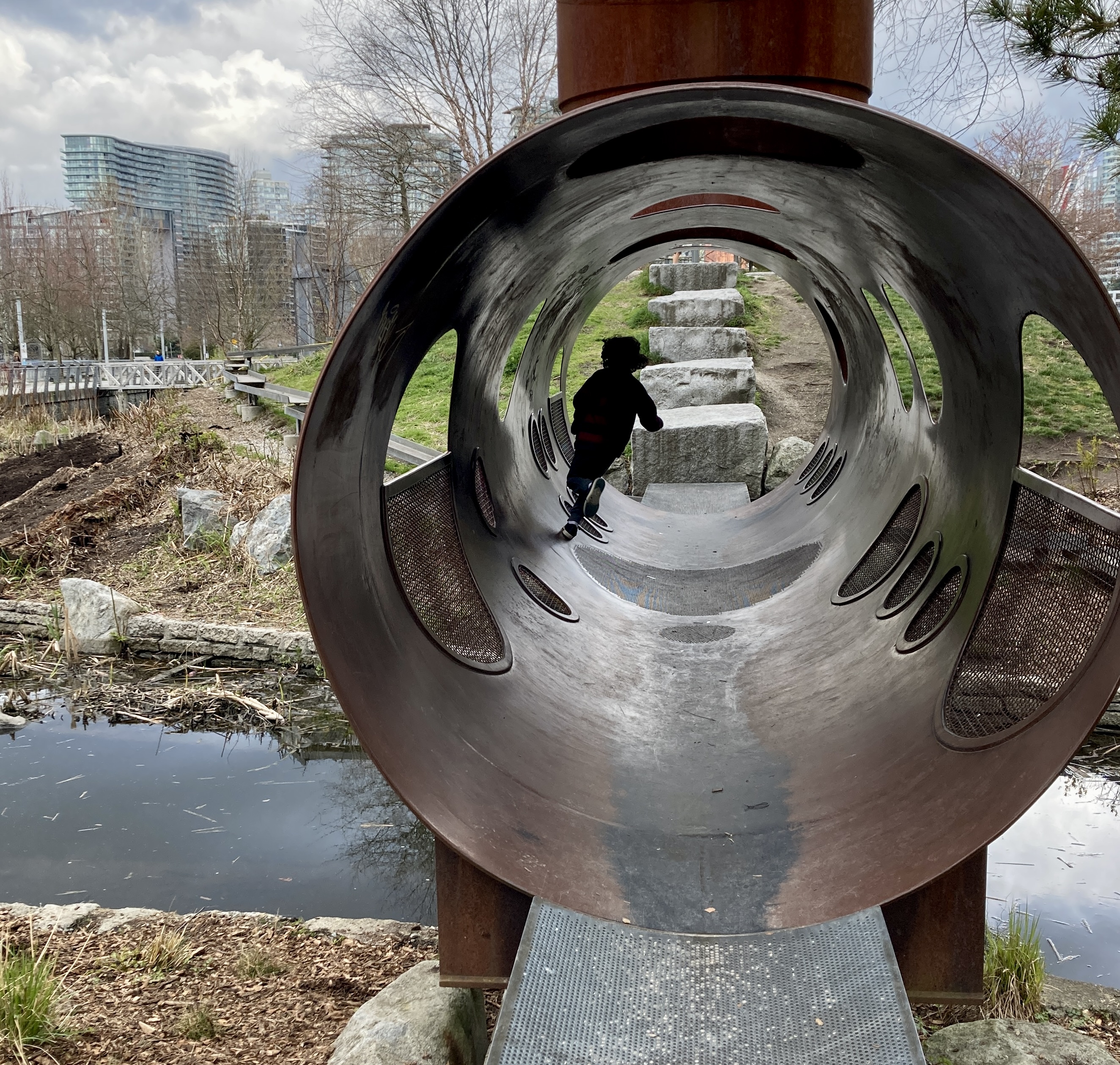 Like them, I turn west on Switchmen St. — a necessary detour while the end bit of Seawall is under repairs — and, from my vantage point at Pullman Porter, watch all those yellow & green T’s double ’round the parking lot & veer back east toward the geodesic dome of Science World. (An aside to you: you have noted these further railway tributes? Of course you have.)