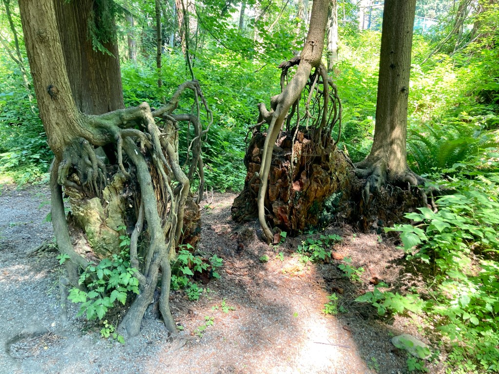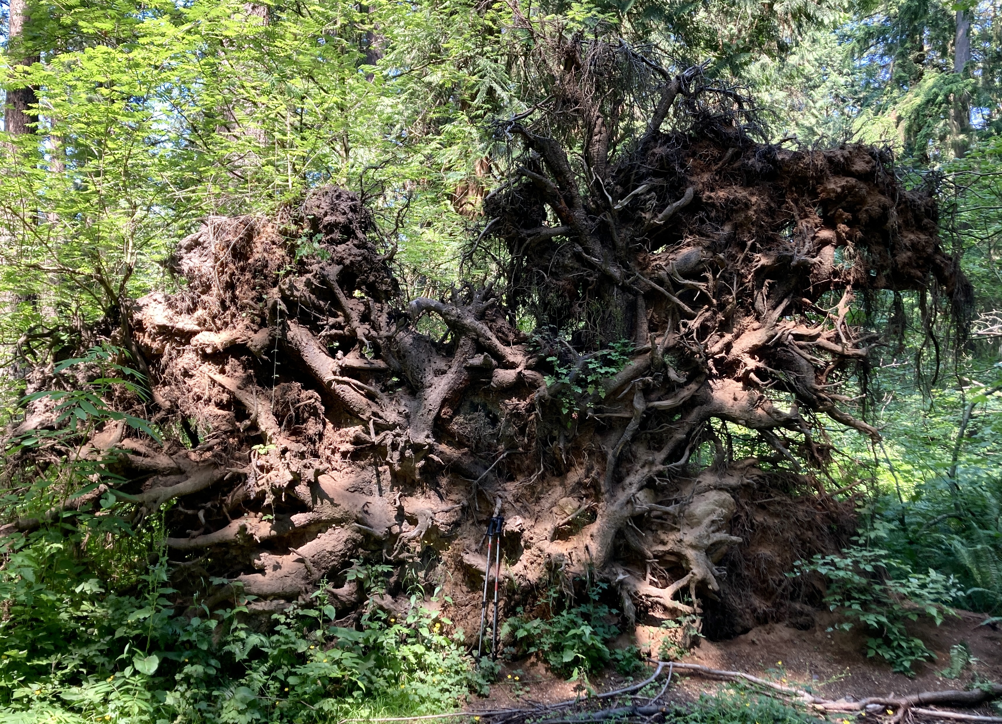 Their laughter is still in my ears when I stop flat at the sight of this up-ended root system. We read about the intricate entanglement of roots below the forest floor… Here it is on display.
