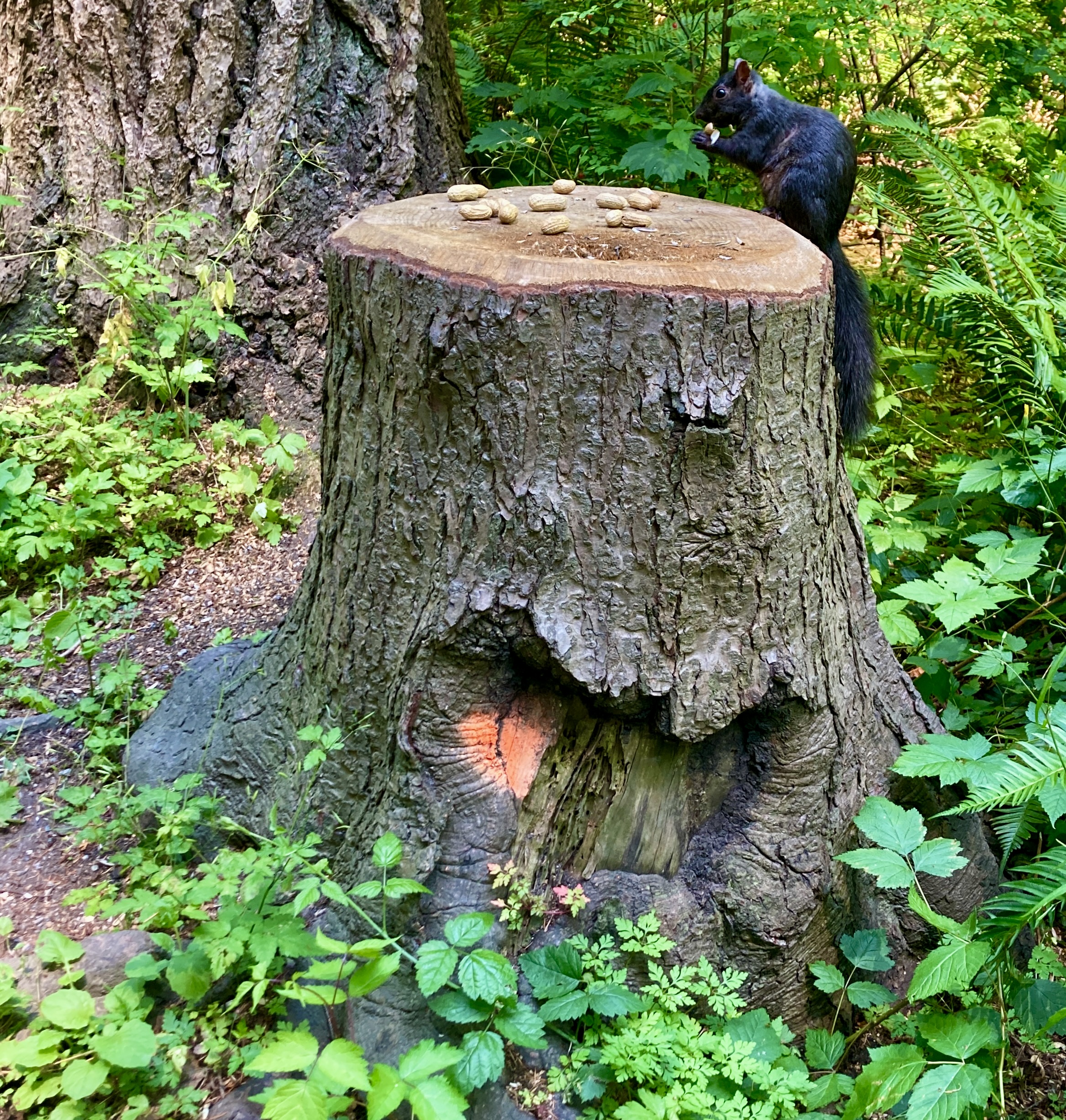 He sits still long enough to be photographed. Later I watch someone try to freeze-frame a chipmunk, who is conducting lightning raids on the peanuts scattered on another tree stump. Happy chipmunk; frustrated human, who finally laughs & gives me the palms-up gesture of defeat.