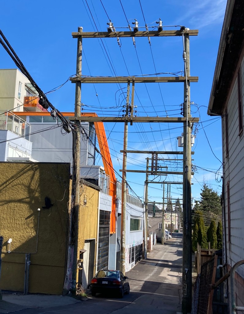 Murals both side of an alley and a whole line-up of hydro H-frame poles in between! Sigh. Life is perfect.