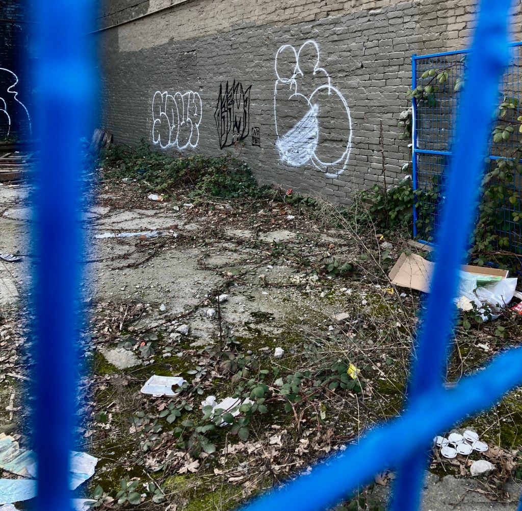 I leave the alley, turn the corner onto W 4th. I’m now looking at the block-long southern length of the site, Ontario to Manitoba. All boarded up, waiting for What Happens Next.